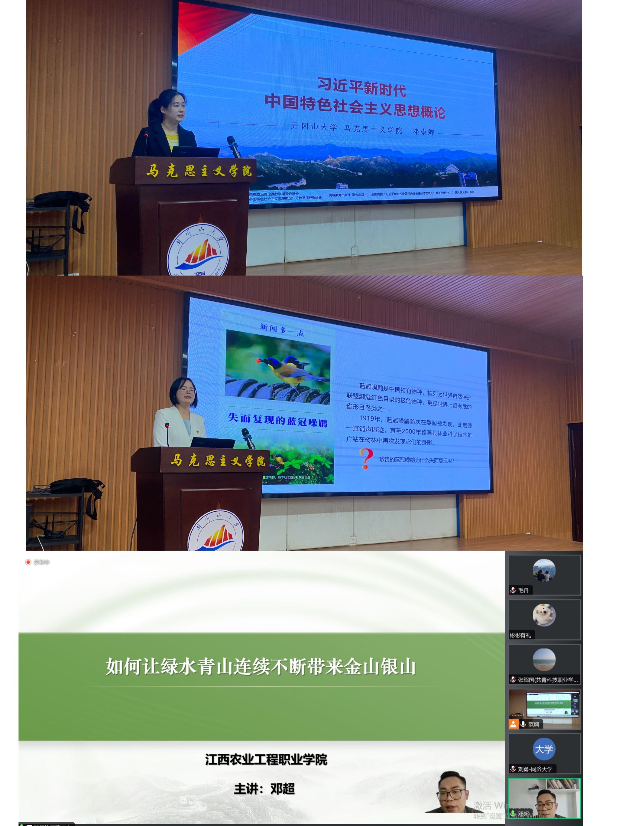 11月16日,由井冈山大学、吉安职业技术学院、吉安幼儿高等专科学校、江西农业工程职业技术学院四所高校联合举办了“习近平新时代中国特色社会主义思想概论”课问题式专题化团队教学改革集体备课会。会议的主题是如何将习近平总书记考察江西重要讲话精神融入“建设社会主义生态文明”专题。会议以线上线下相结合的方式在井冈山大学举行,来自四所高校的近100名任课教师等参加会议。