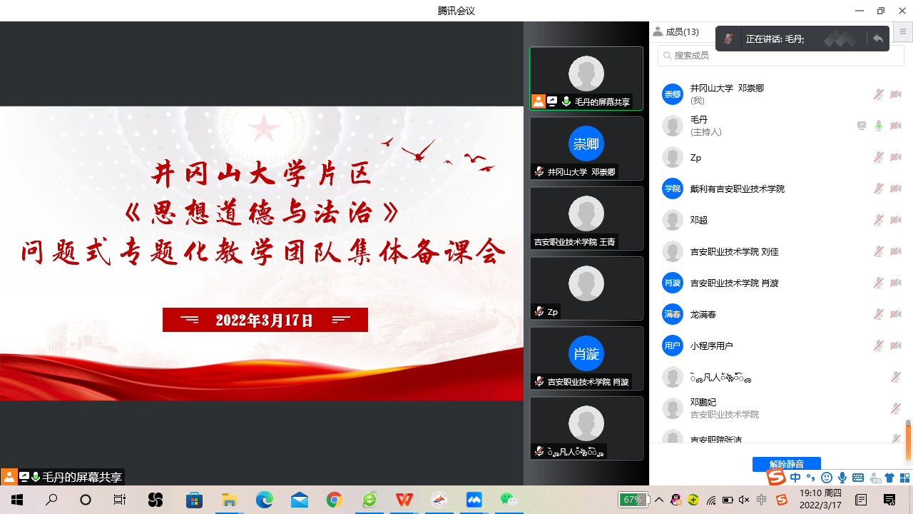 为全面贯彻落实习近平总书记在学校思想政治理论课教师座谈会上的重要讲话精神,做好江西省思政课问题式专题化教学改革工作,3月17日18:30,井冈山大学片区《思想道德与法治》问题式专题化教学团队集体备课会在线上召开,备课议题为“如何做新时代优秀思政课教师——学习习近平总书记在学校思政课座谈会上重要讲话三周年学习交流会”。会议由井冈山大学马克思主义学院副院长毛丹主持,江西农业工程职业学院、吉安职业技术学院、井冈山大学思政课教师参与。