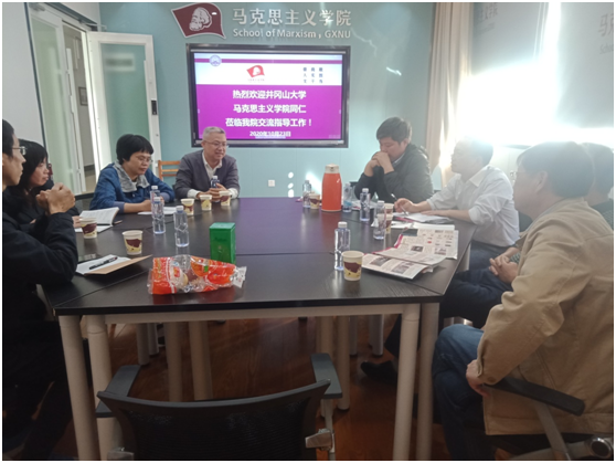 会上,周瑞超书记就学院的历史前沿、学科建设、教育教学、学科研究、人才培养等方面进行了介绍。张梅龙副院长简要介绍了井大马院的基本情况,他表示井冈山大学马克思主义学院在“红色文化”育人方面具有独特优势和先进做法,两院可以在红色文化融入高校课程育人、实践育人、文化育人等方面保持持续性的交流与合作。我院党史教研室教师就人才培养、集体备课、课堂教学、课程建设、教法改革、学生实践等问题与广西大学马院的领导和老师进行了友好而深入的交流。