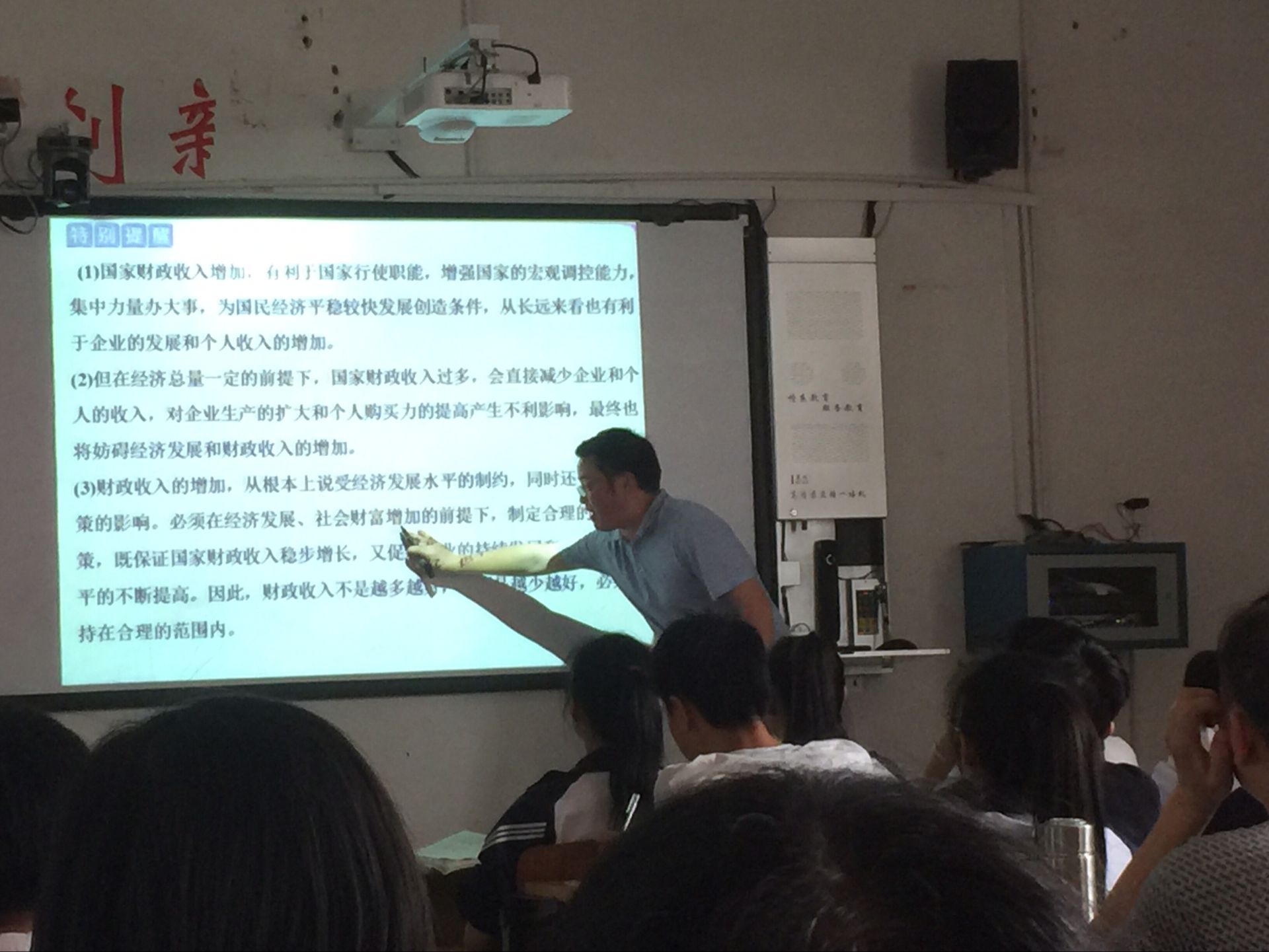 本节课的主要内容是进行高中政治课“经济生活”第一轮复习,主题是财政及其作用,刘老师首先进行课堂导入,通过政府报告和记者提问引入话题。在讲课的同时,运用了知识点新旧对比、对知识点的联系与串联的方法。使得同学们非常直观地看出了课本的考点与要求。在拥有较为热烈的课堂氛围的同时,也不忘指出同学们在学习中经常犯的错误,并且根据时代的要求与时俱进地提出了当前可能会出现的知识点。让同学们更加了解富有时代感的题目。最后强调的一点是,刘老师在讲课的同时,我们明显体会到他在教学中的一系列解题方法,这一点给听课的同学们很大的启示。