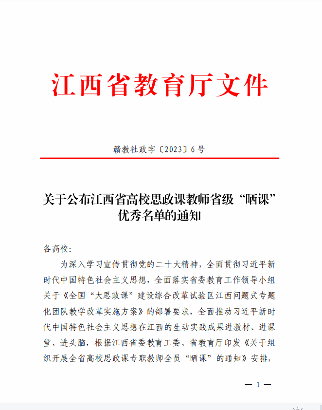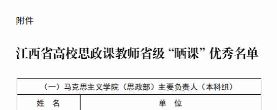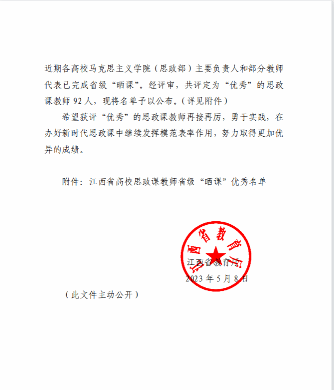 为深入学习宣传贯彻党的二十大精神,全面贯彻习近平新时代中国特色社会主义思想,全面落实省委教育工作领导小组关于《全国“大思政课”建设综合改革试验区江西问题式专题化团队教学改革实施方案》的部署要求,全面推动习近平新时代中国特色社会主义思想在江西的生动实践成果进教材、进课堂、进头脑,根据江西省委教育工委、省教育厅印发《关于组织开展全省高校思政课专职教师全员“晒课”的通知》安排,我院郑佩、邓崇卿两名教师参加了“晒课”活动并获得优秀。(撰:曾楚乔 审:毛丹 吴丽花 叶丹)