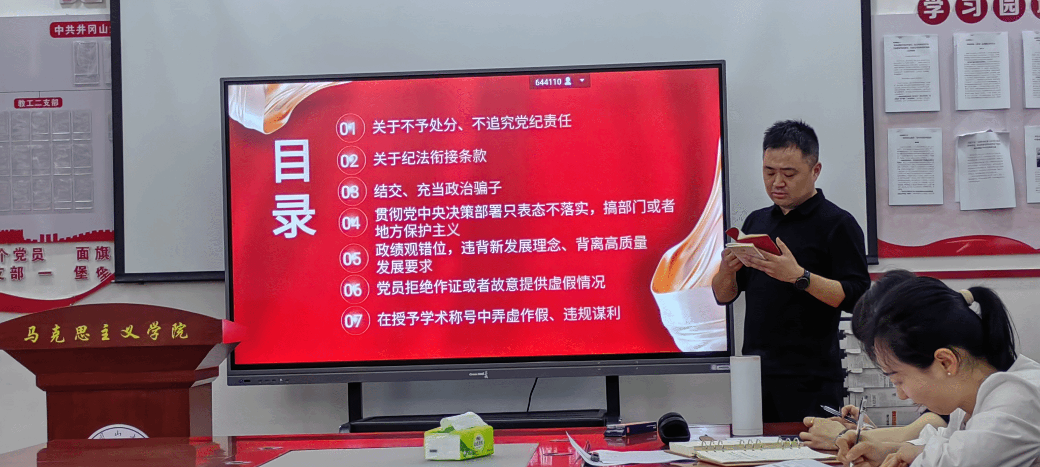 4月22日,按照学院党纪学习教育工作方案安排,马克思主义学院举办了党委理论中心组专题党课,党委班子成员和各科室负责人参加学习会。