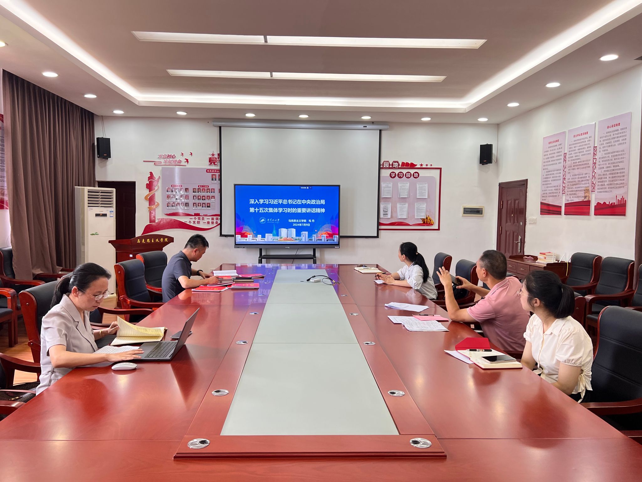 2024年7月9日,马克思主义学院开展了党委理论中心组学习会,会议由学院党委书记叶丹主持,学习习近平总书记在中央政治局第十五次集体学习时的重要讲话精神、关于伟大建党精神的重要论述等内容。