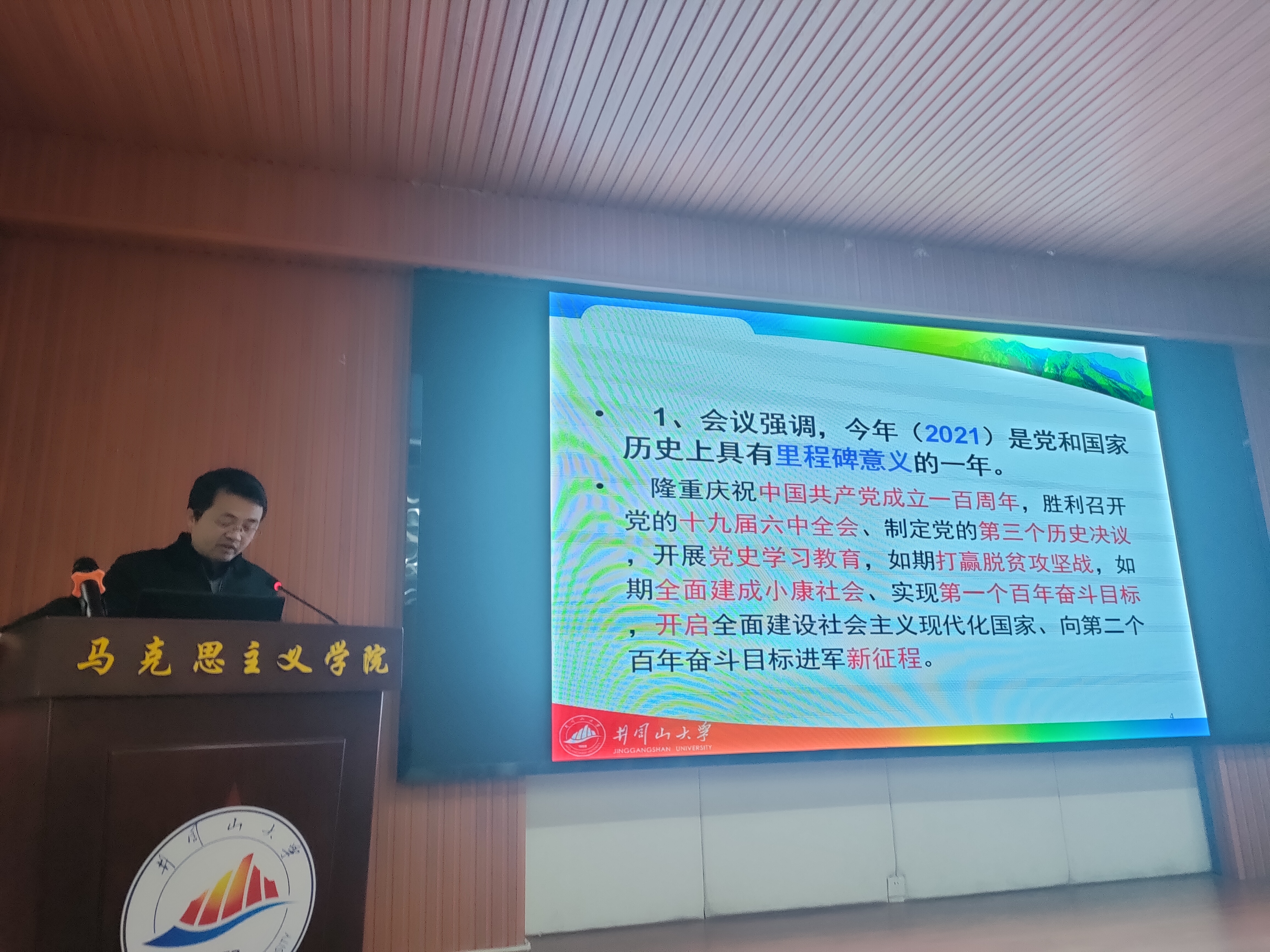 为进一步提升教职工政治素养,增强理想信念,3月3日下午2:30,马克思主义学院于1栋103室召开了全体教职工政治理论学习专题会,会议由副院长石劲松领学,全体教职工共同参加。