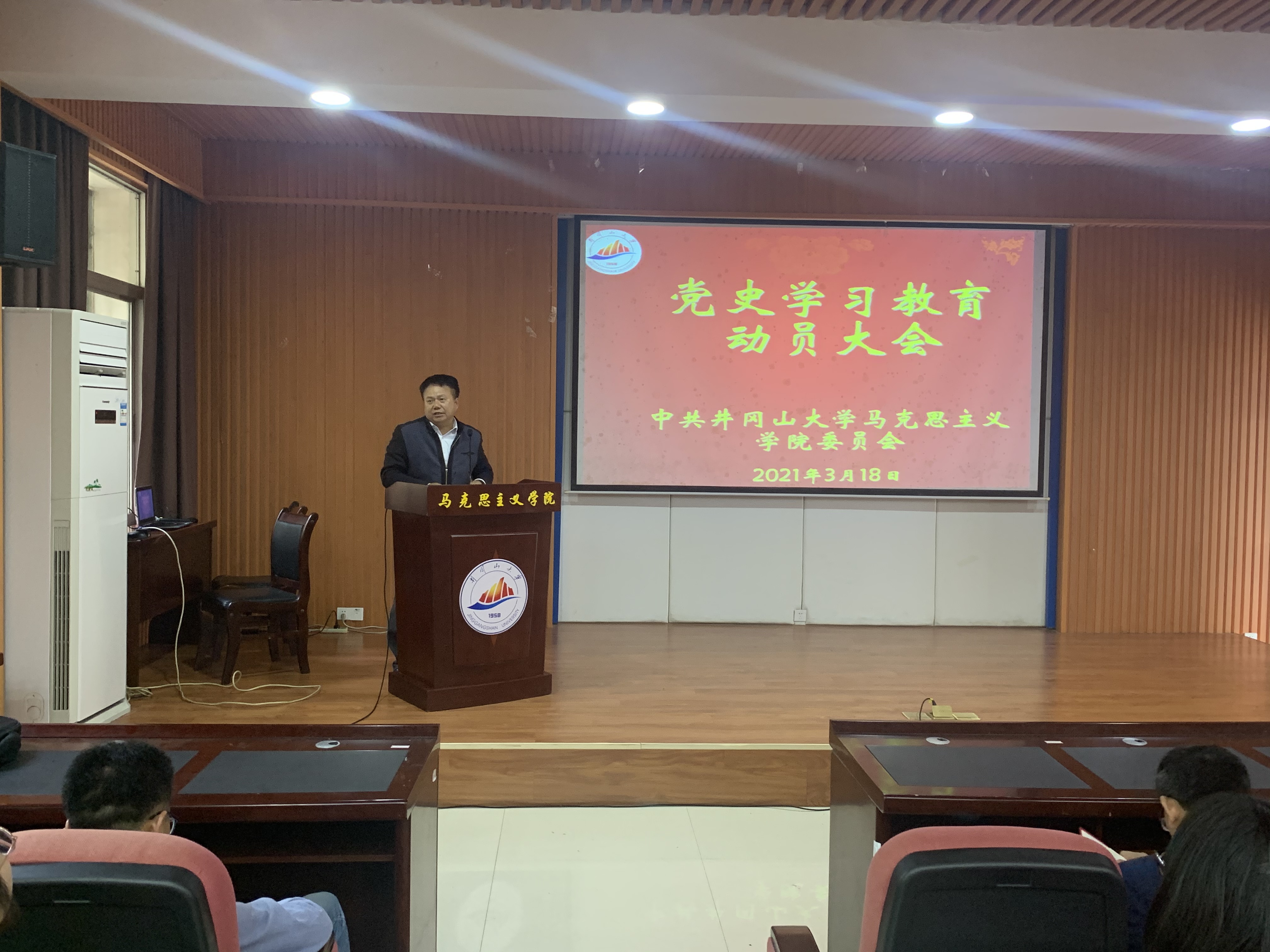 会上,孙斌传达学习了习近平总书记在党史学习教育动员大会上的讲话、省委书记刘奇在全省党史学习教育动员大会上的讲话、校党委书记胡春晓在全校党史学习教育动员大会上的讲话,宣布了学院的党史学习教育实施方案及领导机构。他强调:要提高政治站位,深刻认识到开展学习党史教育的重要意义;要在学懂弄通做实方面下功夫,做到学史明理、学史崇德、学史增信、学史力行;要开展形式多样的学习教育活动,突出学习重点,用好井冈山红色资源;要把开展党史学习教育与落实习近平总书记关于“推进红色基因传承”的重要要求相结合,多出好的作品、好的成果。