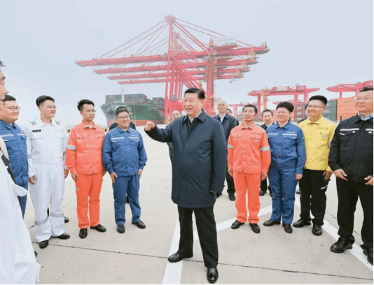 2024年5月22日至24日,中共中央总书记、国家主席、中央军委主席习近平在山东考察。这是22日下午,习近平在日照港亲切慰问港口科技工作者、运营人员、航运人员。新华社记者 谢环驰/摄