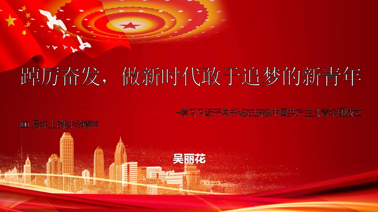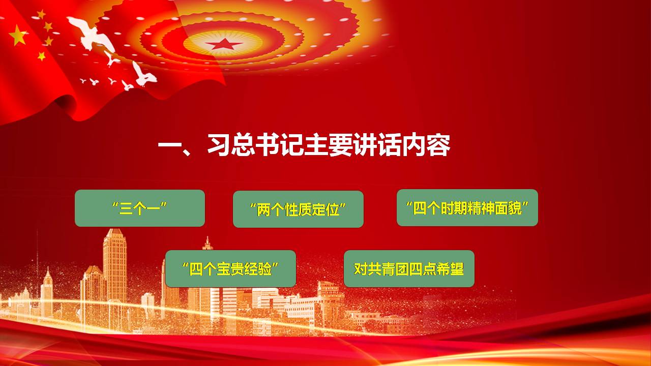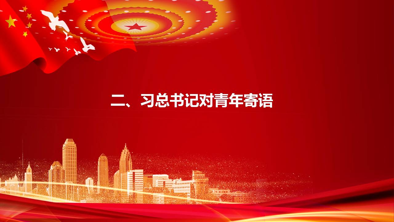 首先,我代表党中央,向全体共青团员和各级共青团组织、团干部,致以热烈的祝贺和诚挚的问候!