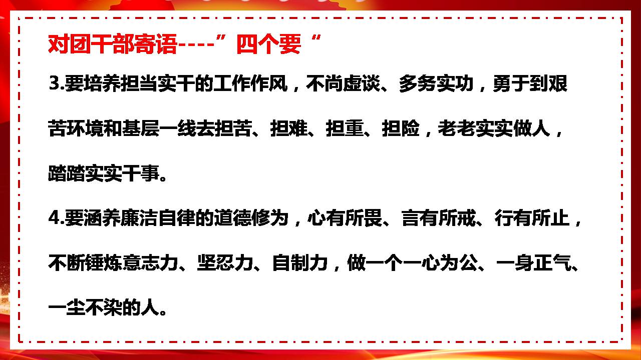 长期以来,广大团干部发扬优良传统,认真履职尽责,为党的青年工作作出了重要贡献。团干部要铸牢对党忠诚的政治品格,高扬理想主义的精神气质,心境澄明,心力茁壮,让人迎面就能感受到年轻干部应有的清澈和纯粹。要自觉践行群众路线、树牢群众观点,同广大青年打成一片,做青年友,不做青年“官”,多为青年计,少为自己谋。要培养担当实干的工作作风,不尚虚谈、多务实功,勇于到艰苦环境和基层一线去担苦、担难、担重、担险,老老实实做人,踏踏实实干事。要涵养廉洁自律的道德修为,心有所畏、言有所戒、行有所止,不断锤炼意志力、坚忍力、自制力,做一个一心为公、一身正气、一尘不染的人。