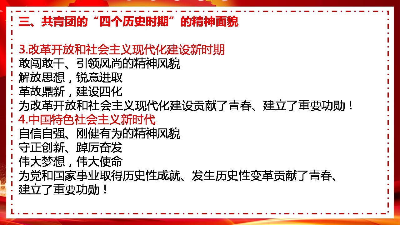 中国特色社会主义新时代,共青团积极投身伟大斗争、伟大工程、伟大事业、伟大梦想波澜壮阔的实践,坚持守正创新、踔厉奋发,全面深化自身改革,团结带领广大团员青年在脱贫攻坚战场摸爬滚打,在科技攻关岗位奋力攀登,在抢险救灾前线冲锋陷阵,在疫情防控一线披甲出征,在奥运竞技赛场奋勇争先,在保卫祖国哨位威武守护,在党和人民最需要的时刻冲得出来、顶得上去,展现出自信自强、刚健有为的精神风貌。“清澈的爱,只为中国”,成为当代中国青年发自内心的最强音。伟大梦想,伟大使命,广大团员青年自觉担当重任,深入基层一线,让青春在实现中华民族伟大复兴的中国梦中绽放异彩,为党和国家事业取得历史性成就、发生历史性变革贡献了青春、建立了重要功勋!