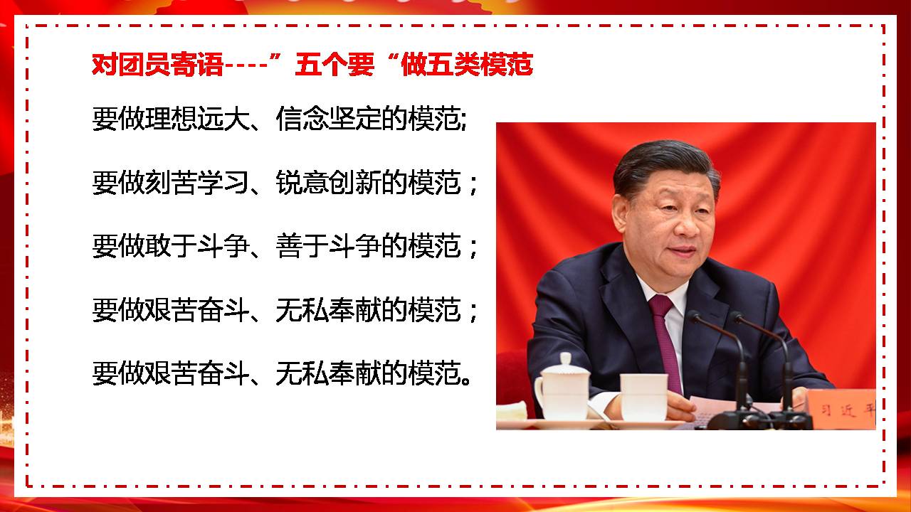 1937年,毛泽东同志为陕北公学成立题词时说:“要造就一大批人,这些人是革命的先锋队。这些人具有政治远见。这些人充满着斗争精神和牺牲精神。这些人是胸怀坦白的,忠诚的,积极的,与正直的。这些人不谋私利,唯一的为着民族与社会的解放。这些人不怕困难,在困难面前总是坚定的,勇敢向前的。这些人不是狂妄分子,也不是风头主义者,而是脚踏实地富于实际精神的人们。中国要有一大群这样的先锋分子,中国革命的任务就能够顺利的解决。”今天,党和人民同样需要一大批这样的先锋分子,党中央殷切希望共青团能够培养出一大批这样的先锋分子。这是党的殷切期待,也是祖国和人民的殷切期待!