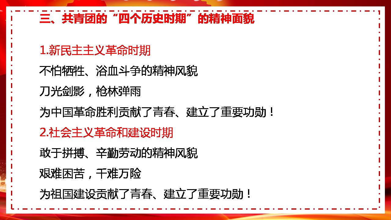 新民主主义革命时期,共青团广泛传播马克思主义,用先进思想启迪青年觉醒、凝聚青春力量,团结带领广大团员青年踊跃投身反帝反封建的工人运动、农民运动、学生运动,积极参加党领导的革命武装,在打倒军阀、抗日救亡、推翻国民党反动统治的伟大斗争中冲锋陷阵,展现出不怕牺牲、浴血斗争的精神风貌。刀光剑影,枪林弹雨,广大团员青年对党忠贞不渝,经受住了生与死的考验,为中国革命胜利贡献了青春、建立了重要功勋!