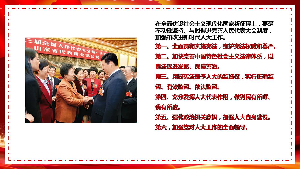 习近平提出6点要求。在全面建设社会主义现代化国家新征程上,我们要毫不动摇坚持、与时俱进完善人民代表大会制度,加强和改进新时代人大工作。