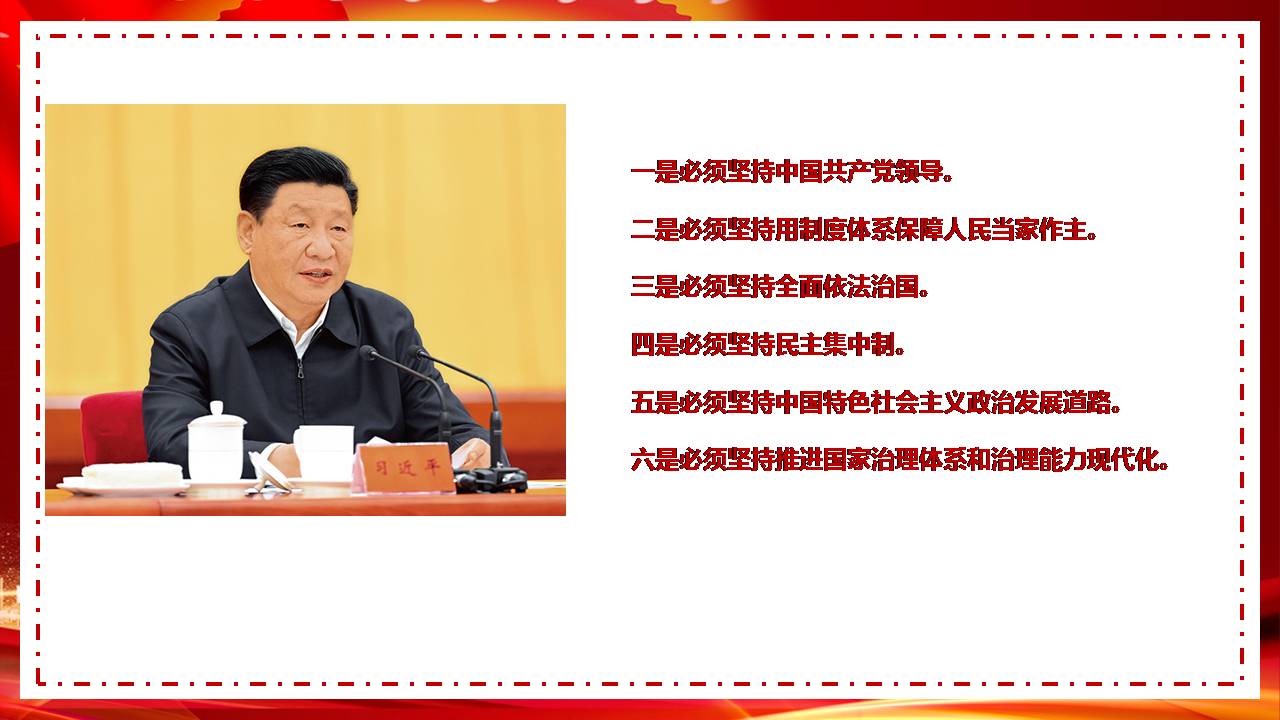 六是必须坚持推进国家治理体系和治理能力现代化。人民代表大会制度是中国特色社会主义制度的重要组成部分,也是国家治理体系的重要组成部分。要坚持和完善人民当家作主制度体系,不断推进社会主义民主政治制度化、规范化、程序化,更好把制度优势转化为治理效能。