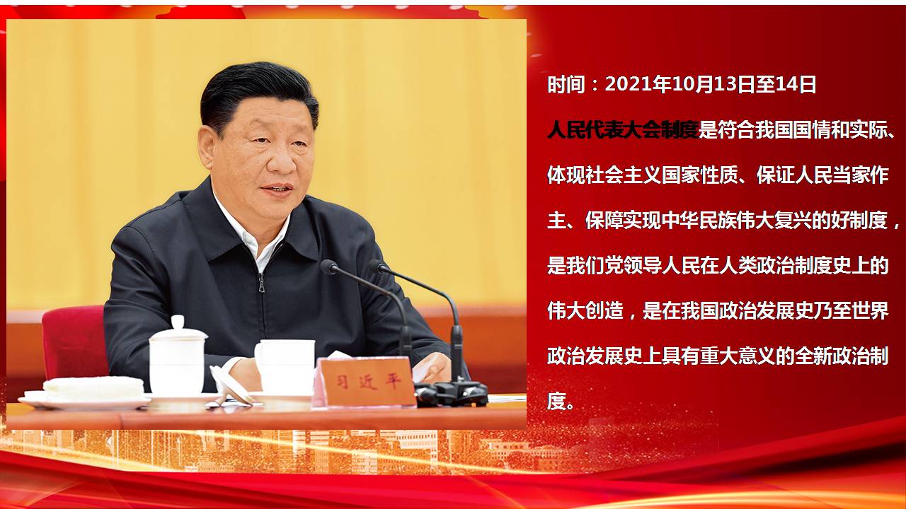 2021年10月13日至14日,中央人大工作会议在北京召开。中共中央总书记、国家主席、中央军委主席习近平出席会议并发表重要讲话。
