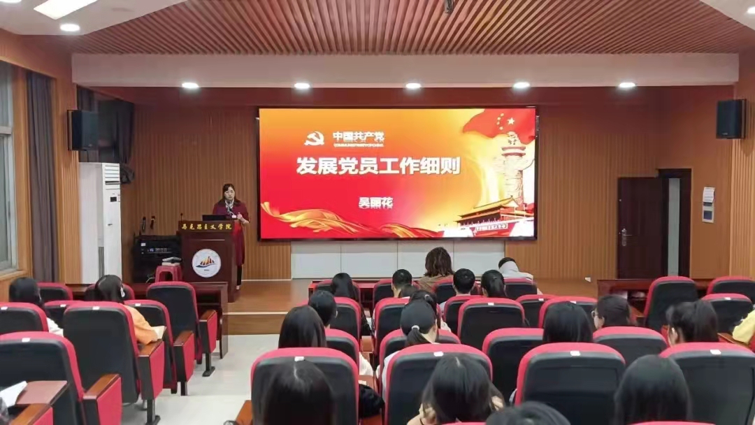 5月13日晚, 马克思主义学院在1栋103学术报告厅开展入党积极分子和预备党员第三个专题培训。培训由学院党委副书记吴丽花带来主题为《发展党员工作细则》的专题讲座,全体入党积极分子和预备党员参加。