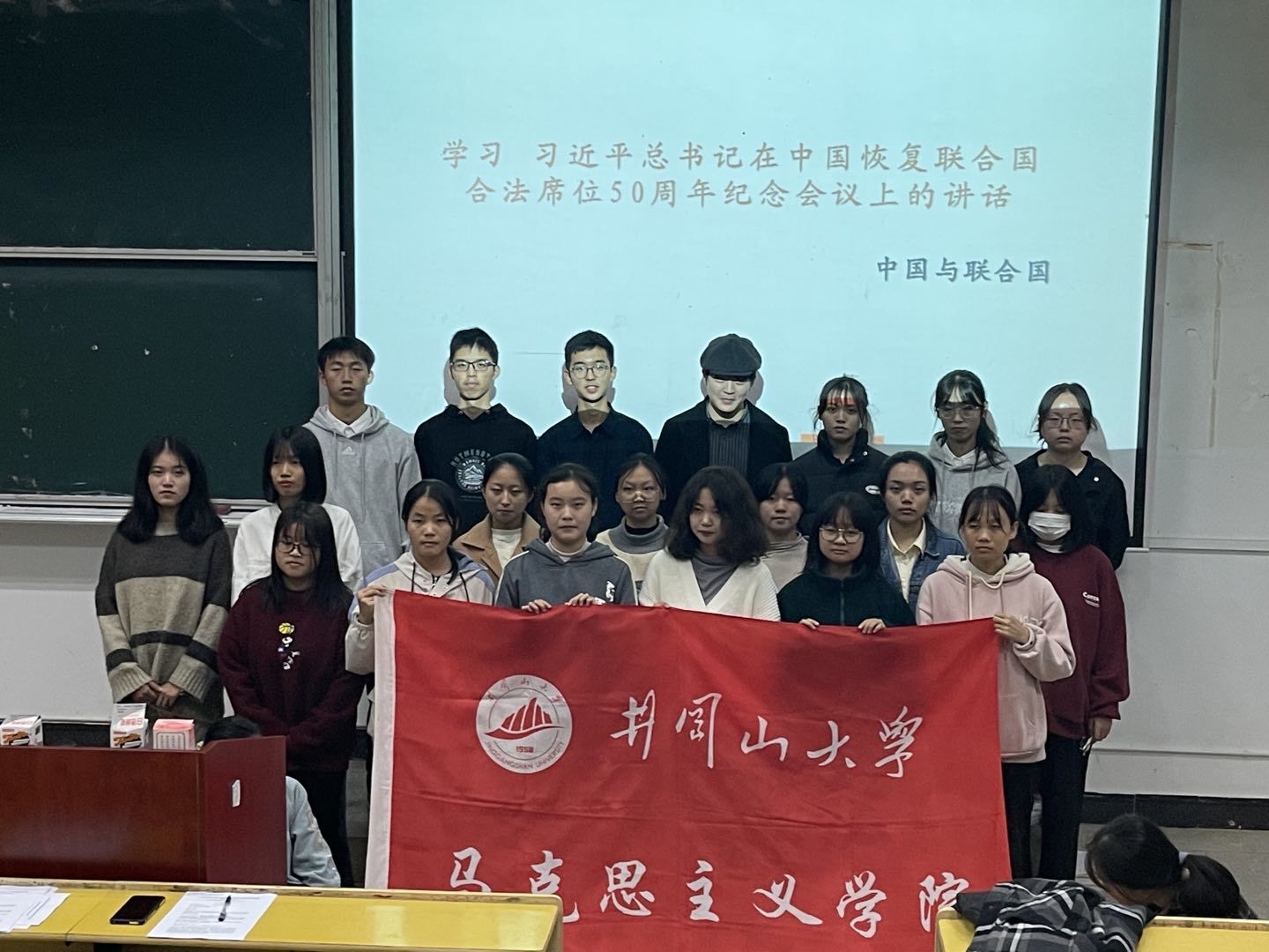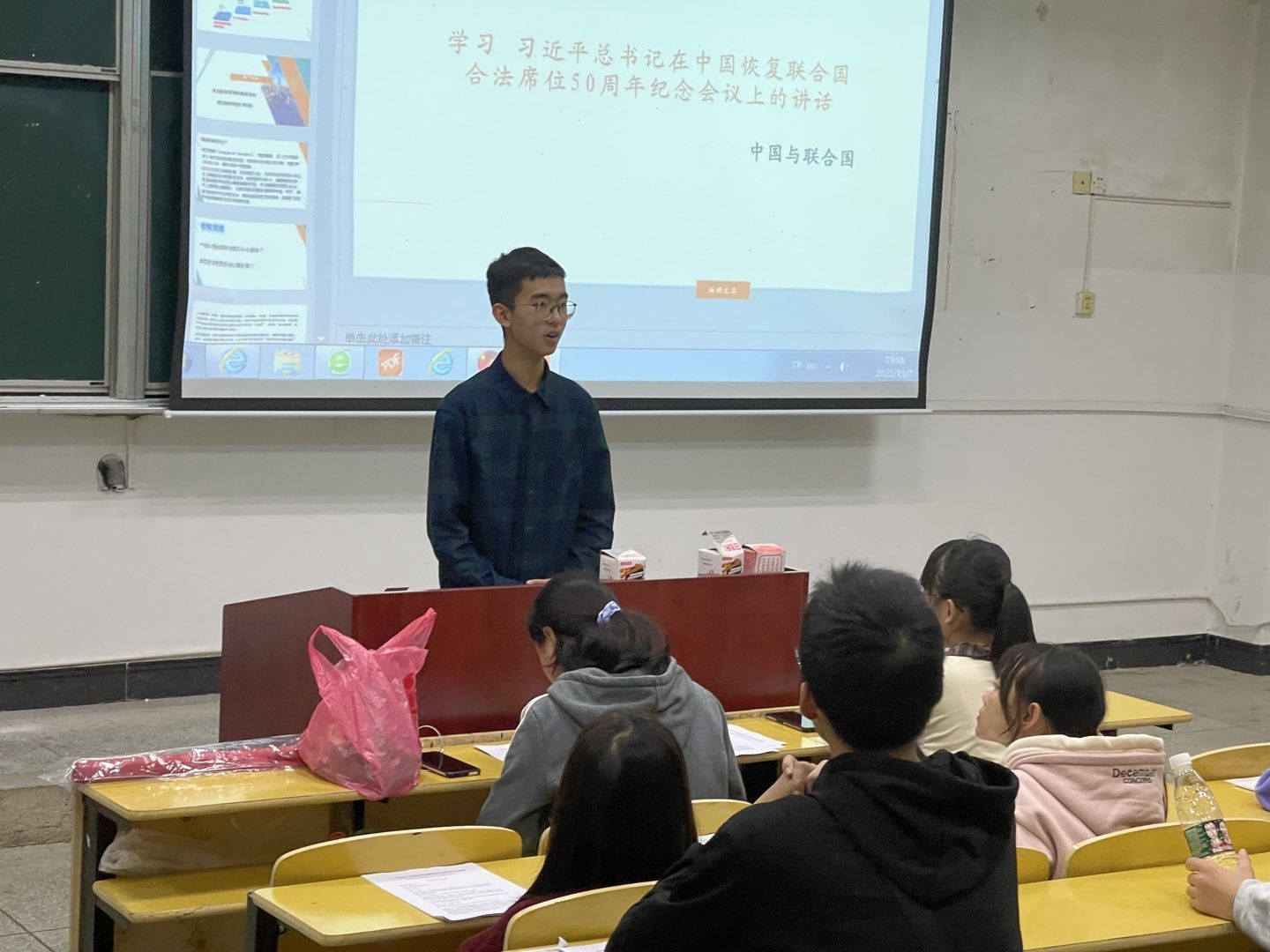 为使同学们更好了解中国在联合国的历史,进一步学习习近平总书记重要讲话精神,马克思主义学院学习部、组织部和青年研学社于2021年11月7日在五栋104教室共同举办宣讲会。本次宣讲会主要围绕习近平总书记在中华人民共和国恢复联合国合法席位50周年会议上的讲话展开,20级党史班陈笑涵同学主讲,马克思主义学院学生代表参加。