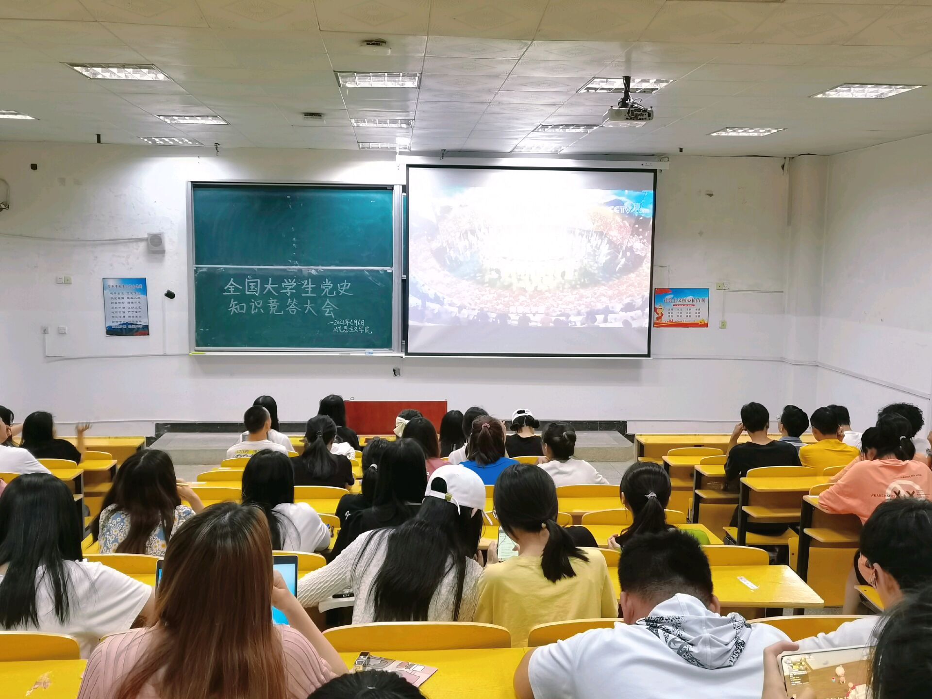 百年恰风华,世纪正青春。由中央广播电视总台策划发起,联合教育部、国家语言文字工作委员会、中共中央党史和文献研究院等部门精心制作的《全国大学生党史知识竞答大会》于2021年6月6日晚上8:00在央视综合频道、央视频、央视网同步播出。马克思主义学院采取集中与分散相结合的观看方式,在播出当晚组织19级、20级学生集中在5-104教室观看节目直播。我院宋安琪同学代表井冈山大学参加比赛。