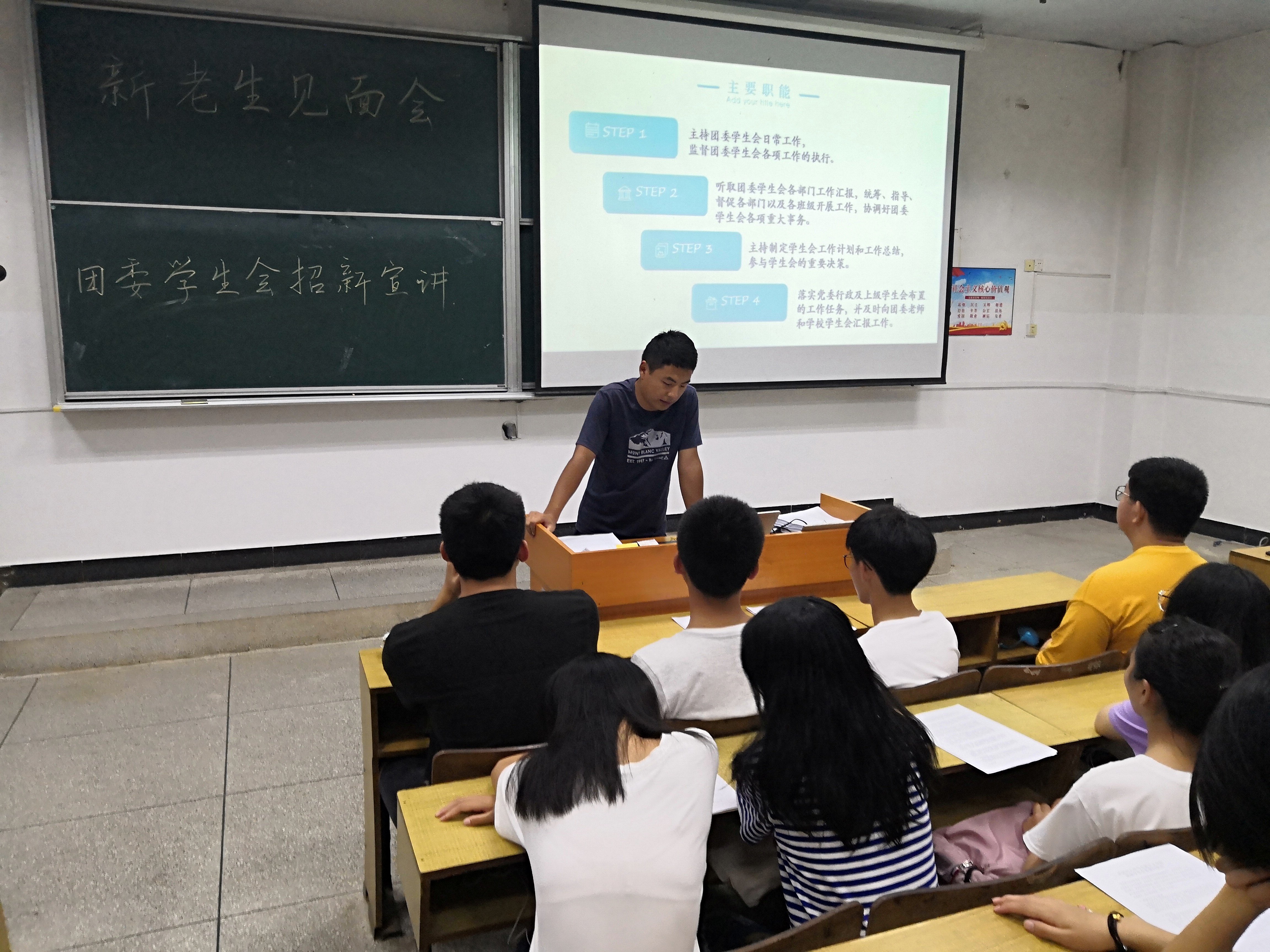 苏杭代表团委学生会热烈欢迎2018级新生,并简单介绍我院团委学生会的情况。团委副书记李鹏飞、部长依次介绍主席团、部门概况、部门职责、部门所需人才等方面进行介绍,希望2018级新生结合自身实际,加入相关部门。