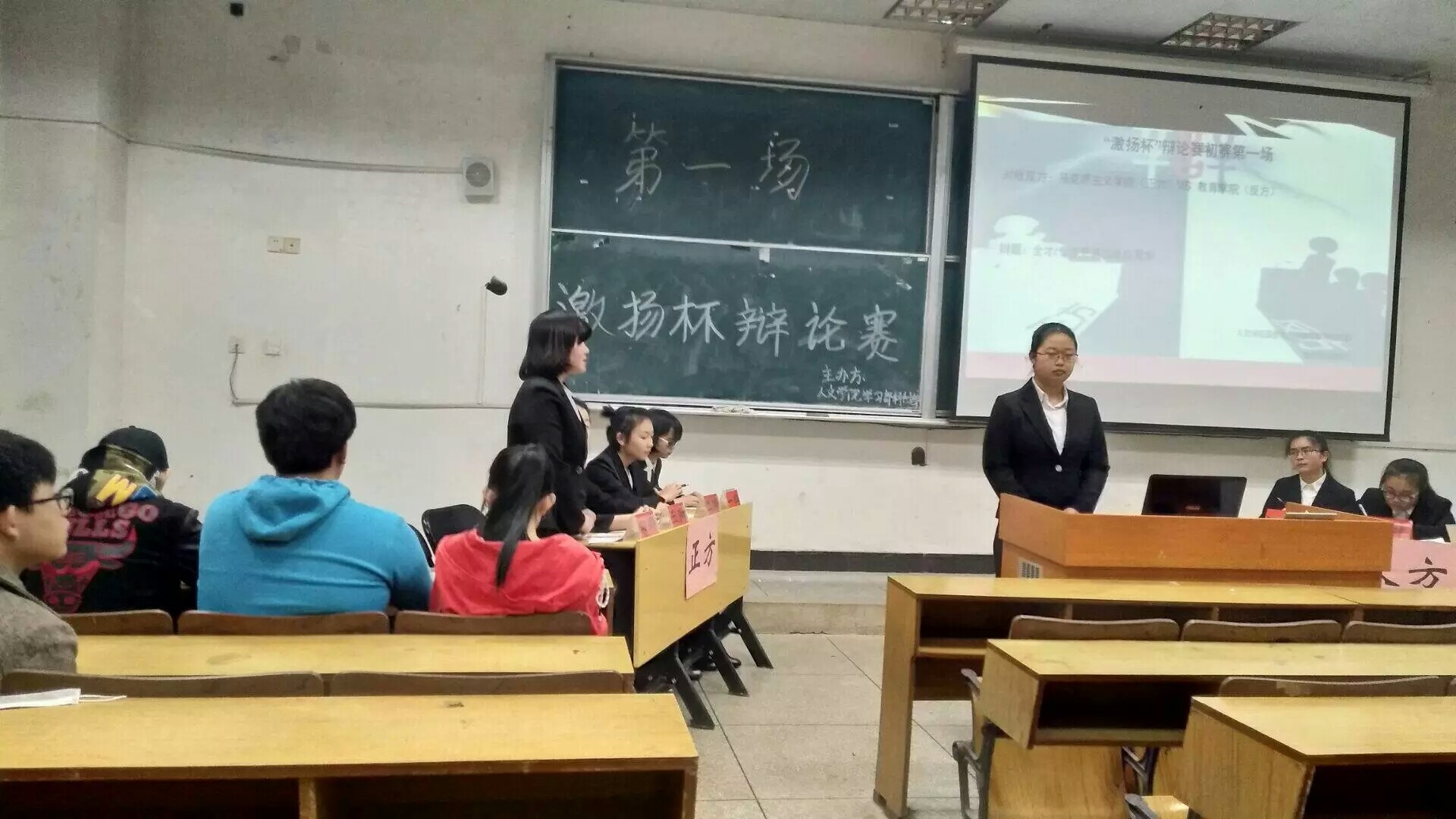 3月25日,我院参加了由人文学院团委学生会学习部和科创部主办的“激扬杯”辩论赛初赛。刘敏、王一大、苏杭和张金金四位同学组成辩论队代表我院参加比赛。 我院辩论队作为正方,与反方就“全才与专才谁更适合社会竞争”的辩题进行辩论。