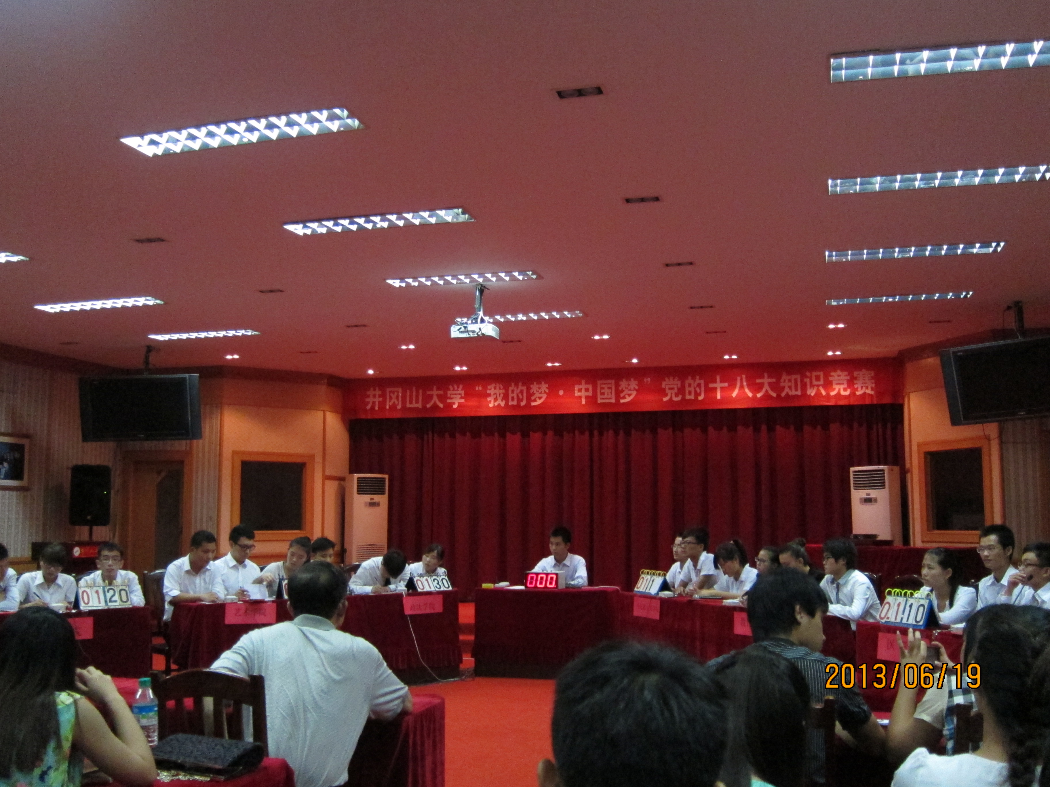 为进一步学习宣传贯彻好党的十八大精神,深入开展中国梦主题宣传教育活动,6月19日晚上七点,由校党委组织部、宣传部主办的“我的梦,中国梦”党的十八大知识竞赛决赛活动在行政大楼四楼会议室隆重举行,全场座无虚席。