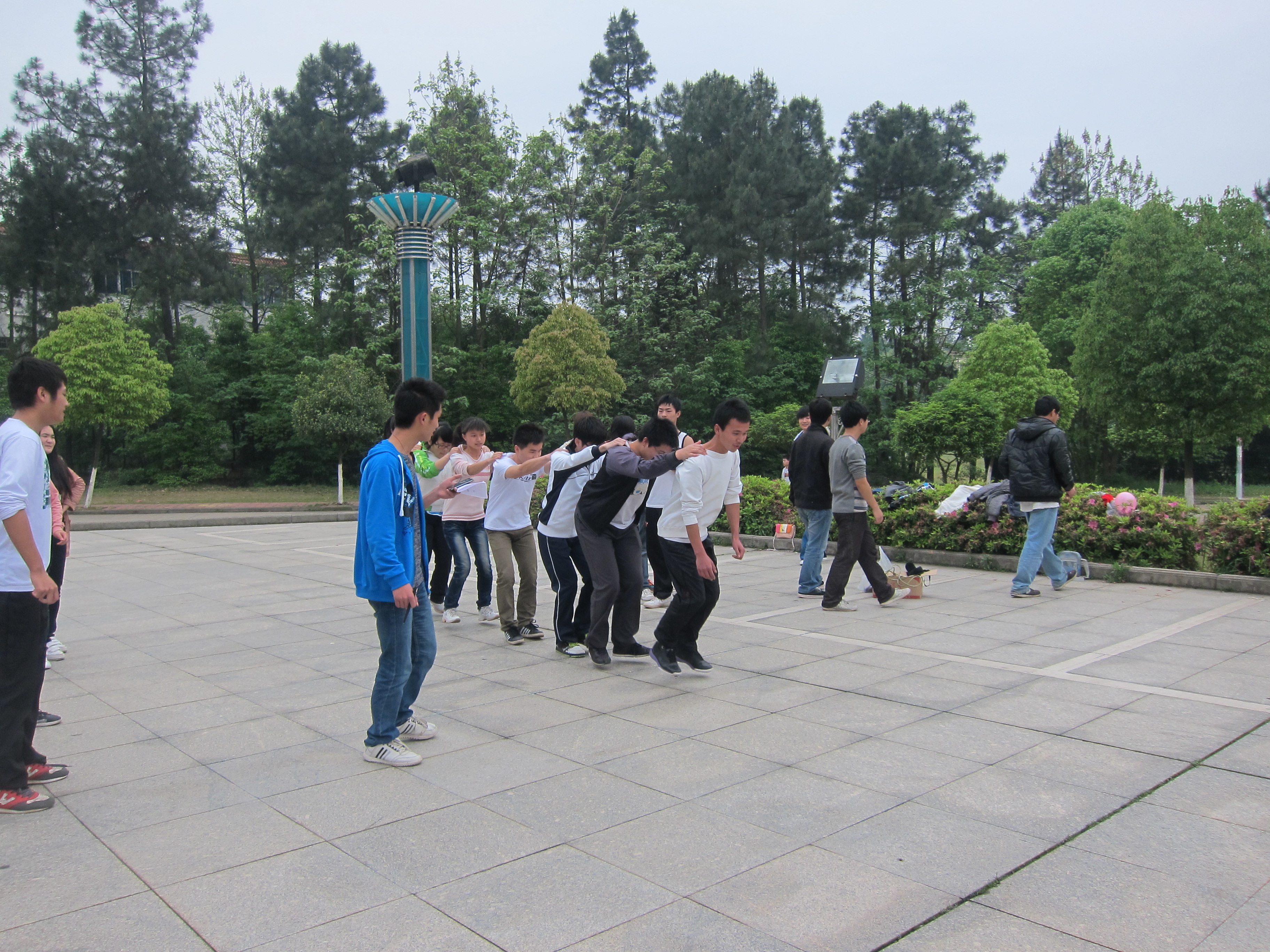 4月13日下午,青马班全体学员在学生会堂前小广场举办了我院大学生骨干培训班最后一项活动——“素质拓展”游戏比赛。主持本次活动的是学院团委曾娟玲老师,同时邀请了政法学院两名学生干部担任裁判及记录员。