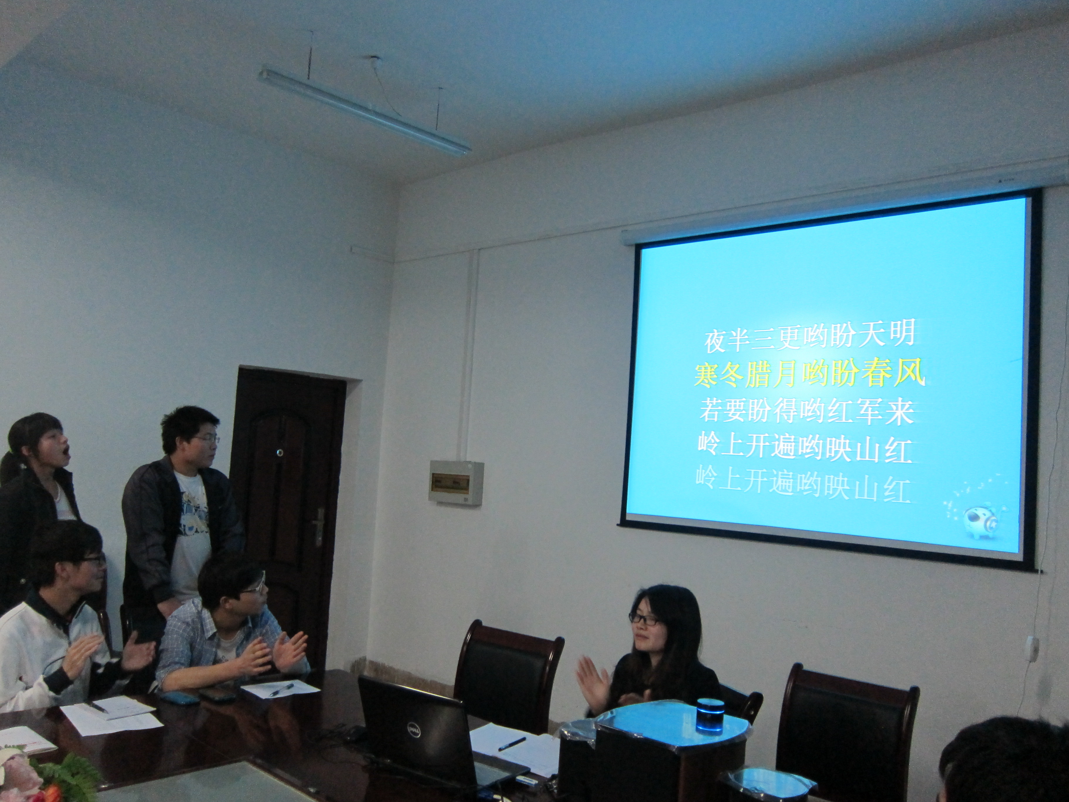 为了激发学员们学习歌曲的积极性,全体学员分为两组,进行拉歌比赛。这期活动学习的主要红歌曲目有:《映山红》、《十里送红军》、《浏阳河》等。七点整,“学习红歌”活动按计划准时开始。一首耳熟能详的《映山红》拉开了此次活动的序幕。伴随着音乐的响起,学员们面对着红色的字幕用心地学唱着,在慷慨激昂的歌声中体悟着中国工农红军的艰辛与魅力。