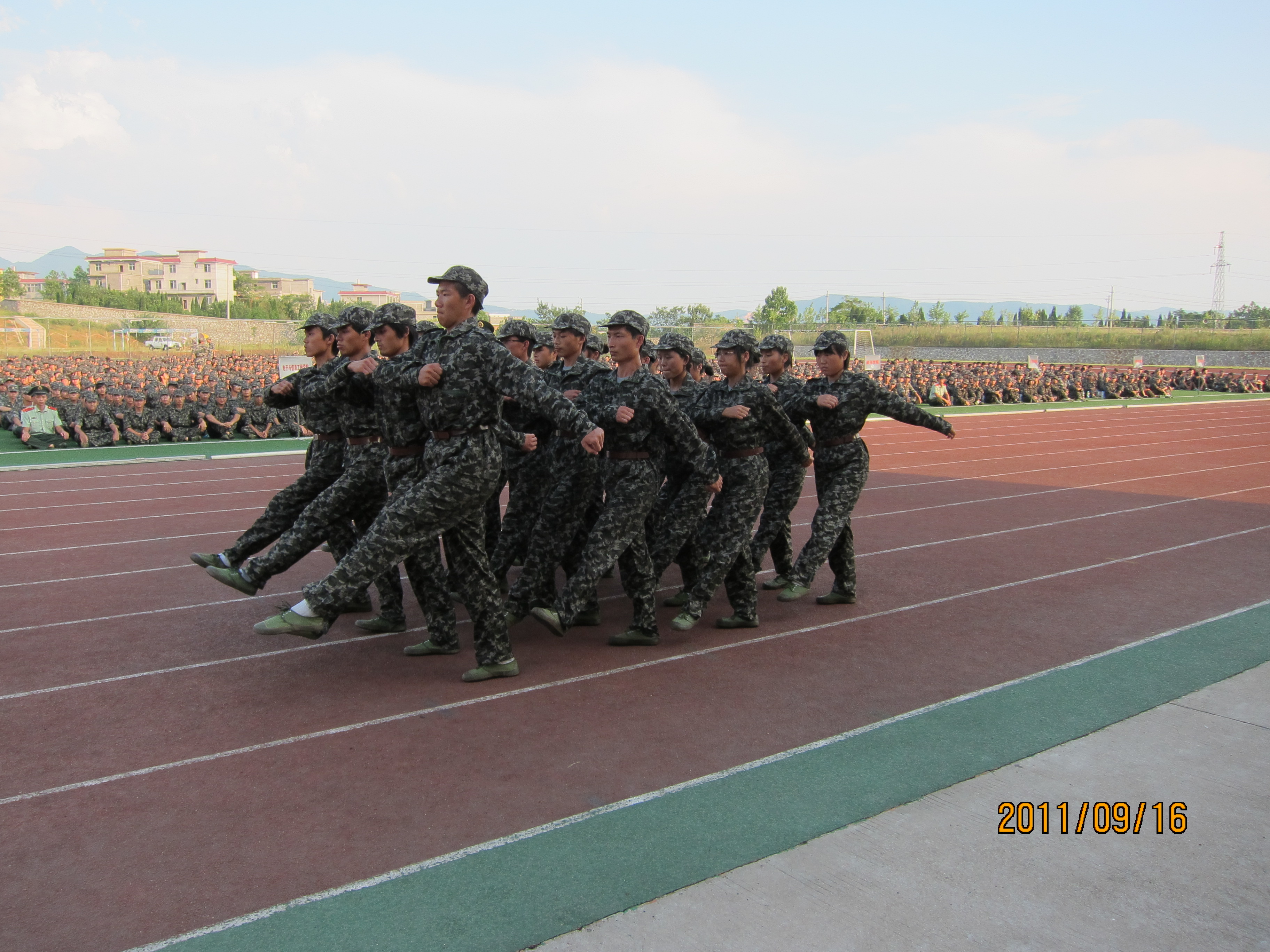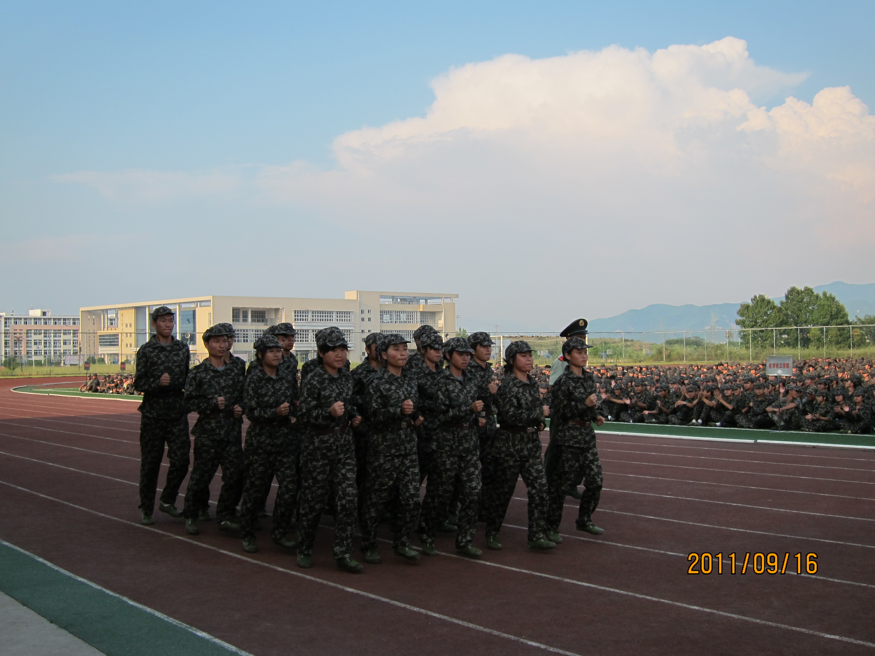 2011年9月16日下午,井冈山大学大一新生军训汇报表演在我校北区运动场顺利举行。湛蓝的天空、雪白的云朵、映衬着迷彩装下那一张张黝黑而青春洋溢的笑脸。全校17个学院的军训表演方队整齐的排列在跑道等候检阅。