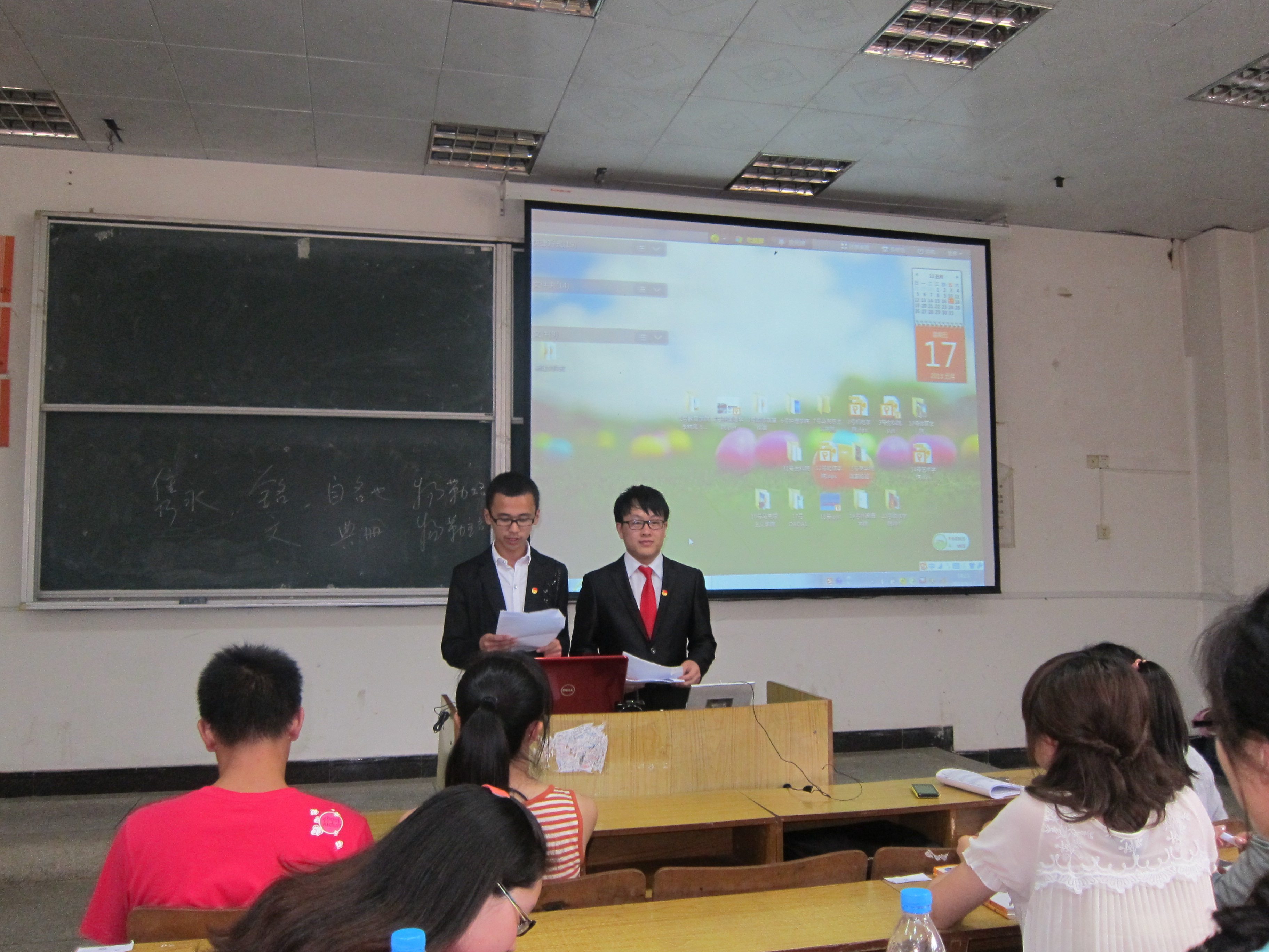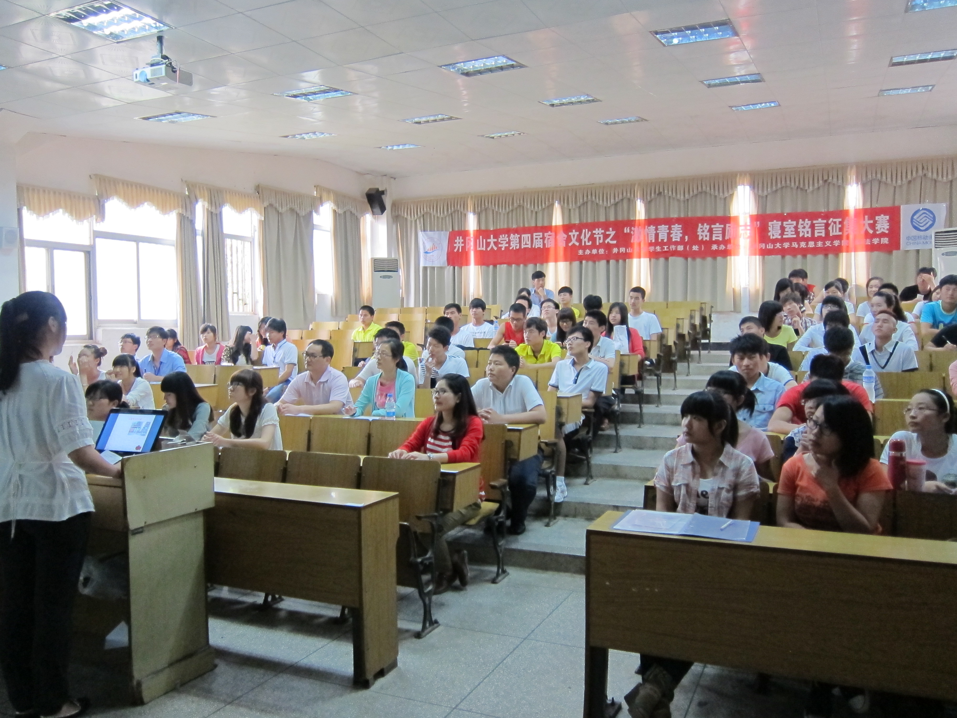 5月17日中午12点40,由我院和政法学院承办的“井冈山大学第四节宿舍文化节之‘激情青春,铭言励志’寝室铭言征集大赛决赛在5栋104教室成功举行。此次比赛邀请了人文学院专业教师徐海斌博士、政法学院学生科副科长时玉柱老师、化学化工学院学生科副科长朱秋美老师担任评委。