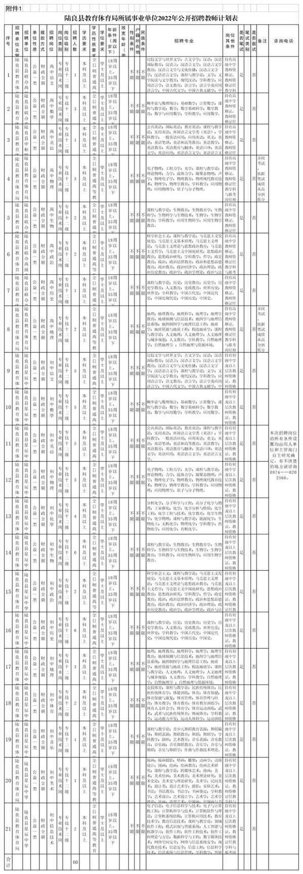 具体招聘岗位、人数及招聘条件详见《陆良县教育体育局所属事业单位2022年公开招聘教师计划表》,该计划表见附表。