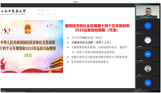 2021年12月16日下午14:30,马克思主义学院邀请江西省就业专家、江西中医药大学招生就业处大学生就业指导中心主任曹森老师给我院学生做就业指导专题讲座。本次讲座通过腾讯会议开展,线上线下相结合,毕业班及学院其他没课年级近200名同学参与聆听学习。