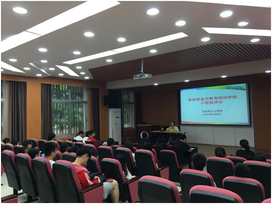 为落实学校就业工作会议精神,做好毕业生的就业工作,推动学院2021届毕业生高质量就业。5月8日上午,马克思主义学院邀请泰和县金贝教育培训学校在1栋103学术报告厅举行就业宣讲会。此次宣讲会由金贝教育培训学校负责人林霞老师主讲,马克思主义学院副院长石劲松、就业干事及我院大三大四的学生参加。