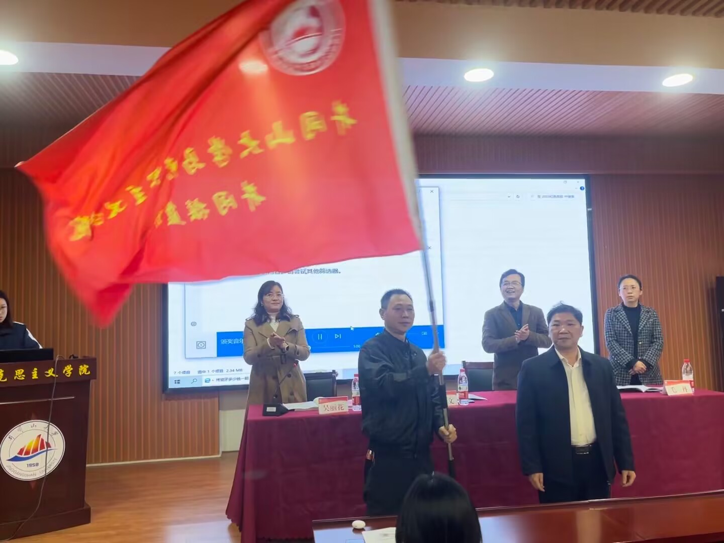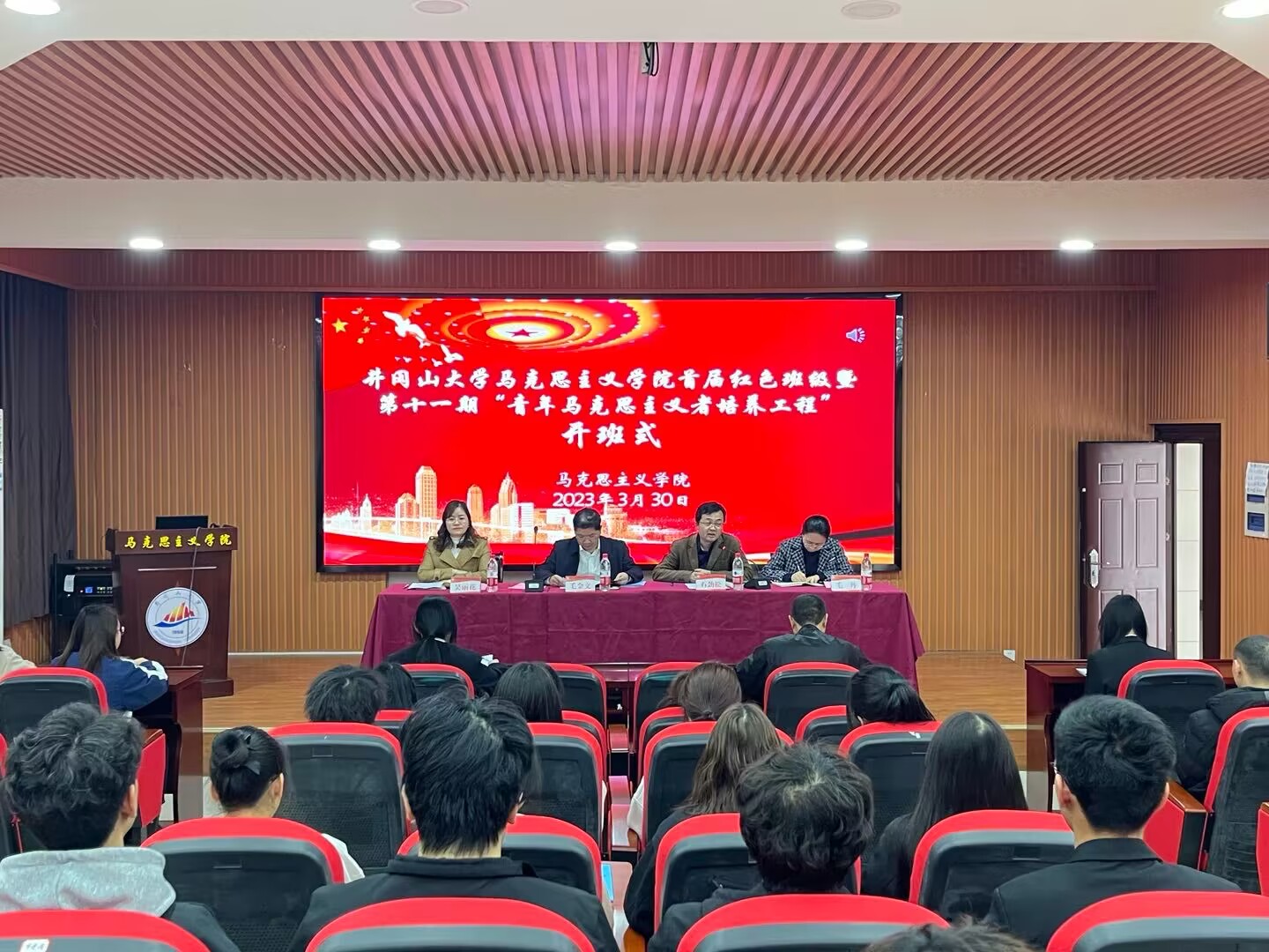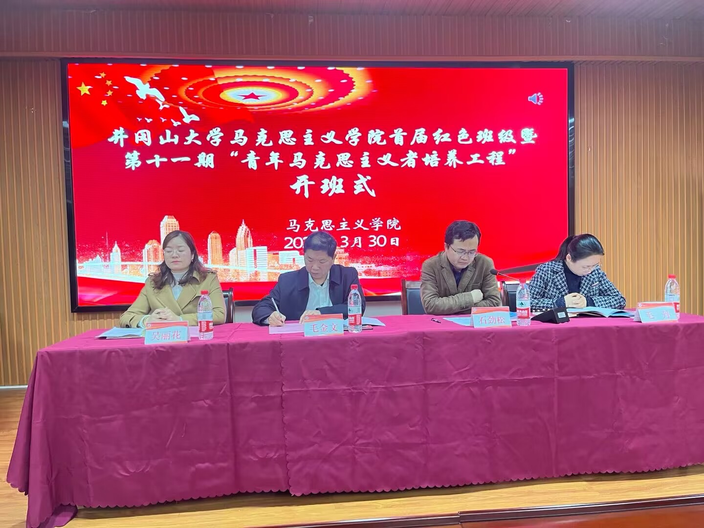 为大力弘扬井冈山精神,赓续红色血脉,传承红色基因,更好地将井冈山及周边地区的红色资源优势转化为办学育人优势,3月30日下午,马克思主义学院在一栋103举行首届红色班级暨第十一期“青年马克思主义者培养工程”开班仪式。仪式由学院副院长石劲松主持,校学生工作部部长毛金文应邀出席并为红色班级授旗。学院领导班子成员、红色班级班主任、班级学员和青马学员等60余人参加。