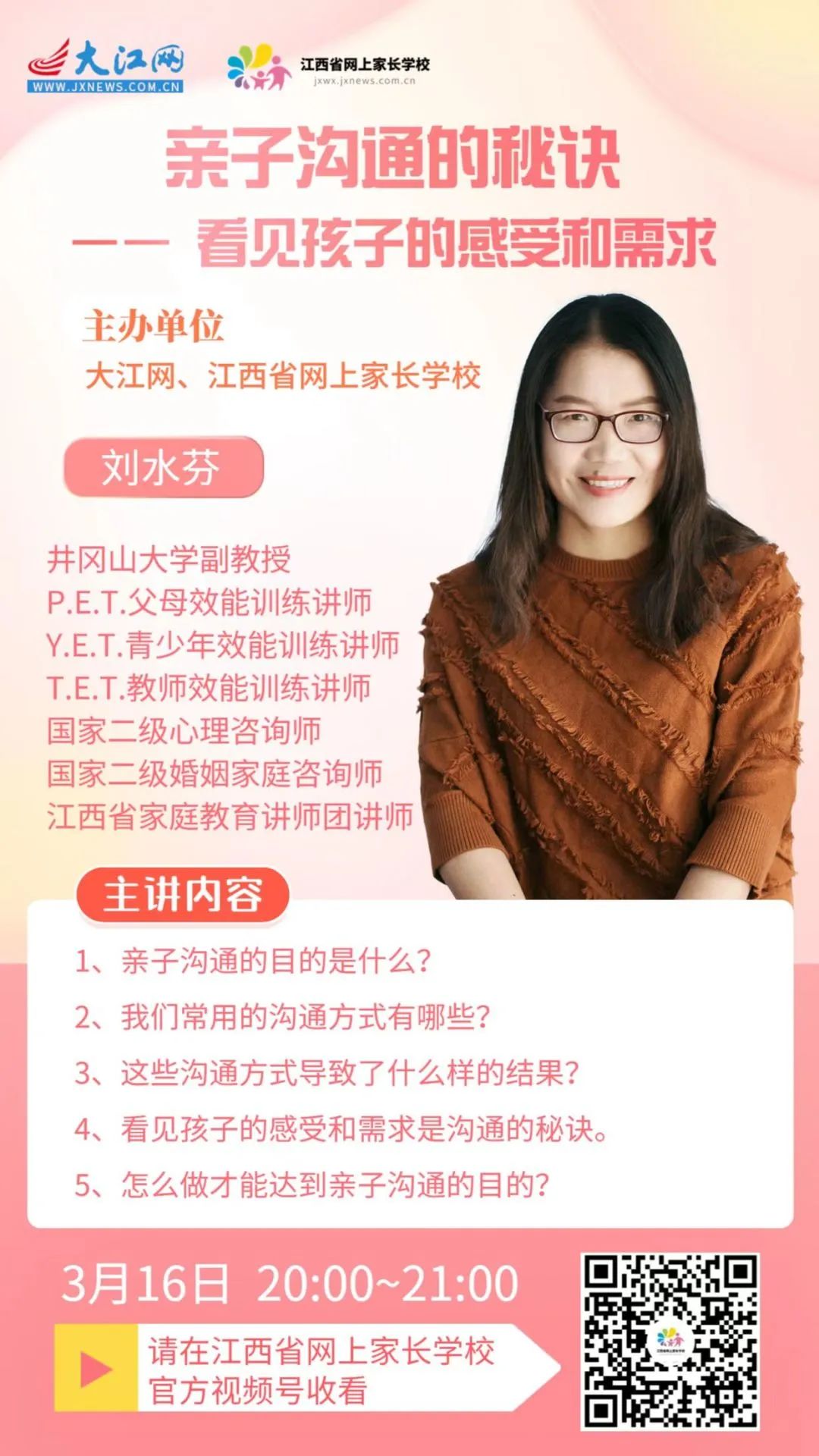 “情绪是信使,背后是需求。当孩子有情绪时,他们需要的不是被控制,而是被看见、被读懂,清楚了孩子行为背后的心理需求,再慢慢地放走这个情绪,这才是应对情绪的正确方法。”3月16日晚,井冈山大学副教授、P.E.T.父母效能训练讲师、Y.E.T.青少年效能训练讲师、T.E.T.教师效能训练讲师、国家二级心理咨询师、国家二级婚姻家庭咨询师、江西省家庭教育讲师团讲师刘水芬教授应大江网邀约,通过江西省网上家长学校官方视频号,为家长们带来以《亲子沟通的秘诀——看见孩子的感受和需求》为题的家庭教育公益直播讲座。