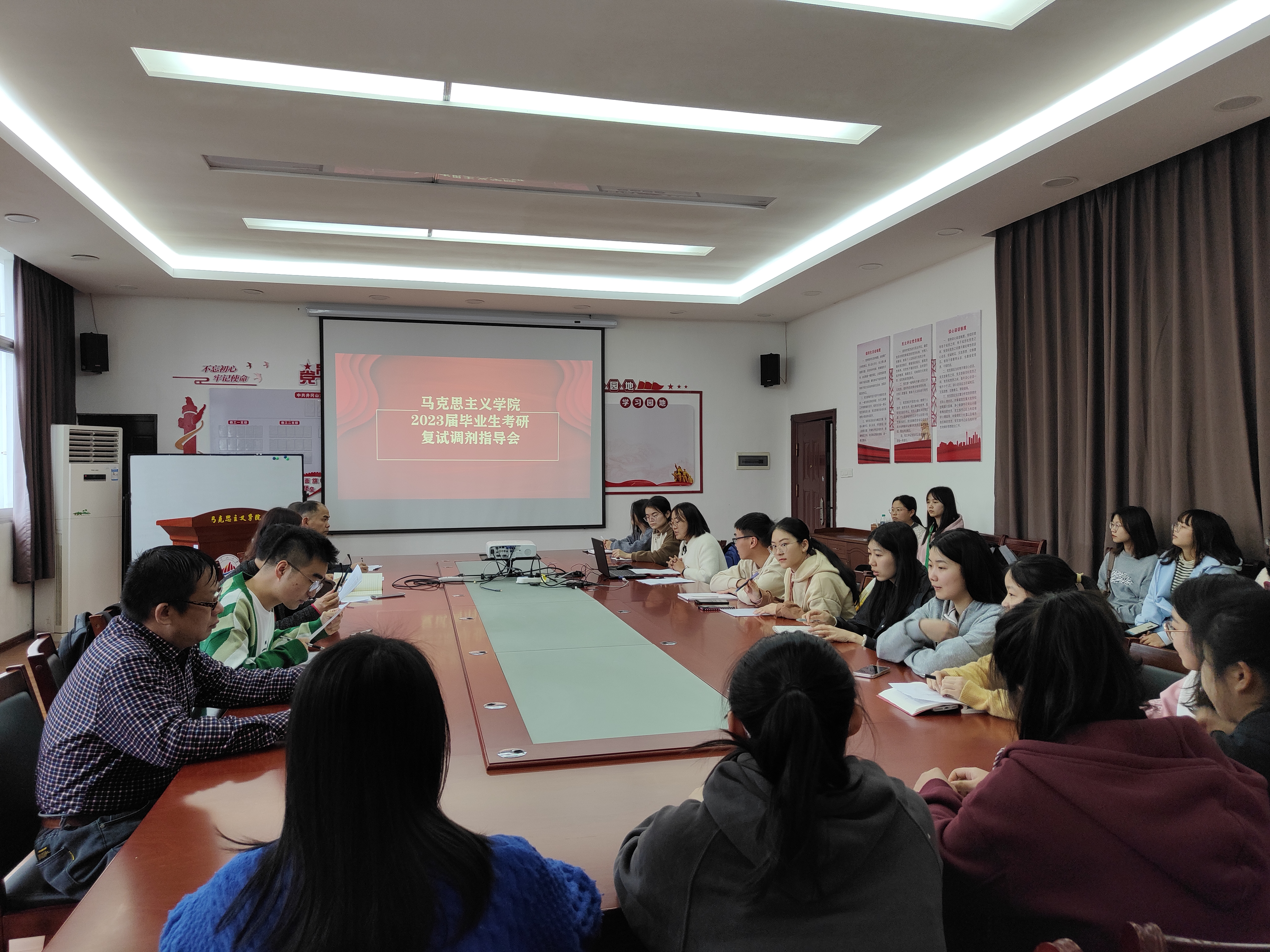 为助力2023届考研学子应对考研复试,提供专业的考研复试与调剂指导,解决复试准备阶段的困难和困惑,马克思主义学院于3月8日下午在1栋307会议室召开2023届毕业生考研复试调剂指导会。会议由学院团委隋欢老师主持,学院党委副书记吴丽花、教师代表肖海鹰、张保和、李壹,2023届毕业生班主任王家明老师和周庆峰老师到场指导。