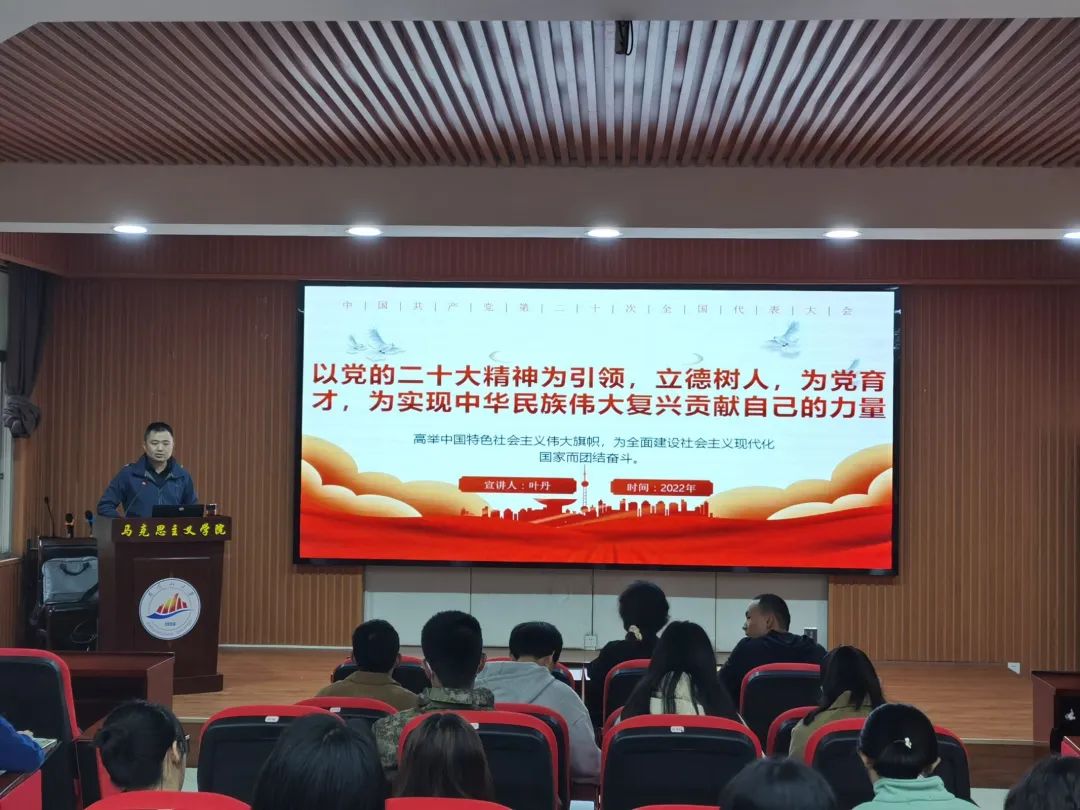 为深入学习贯彻党的二十大精神,11月20日下午,马克思主义学院于1栋103开展了以“以党的二十大精神为引领,立德树人,为党育才,为实现中华民族伟大复兴贡献自己的力量”为主题的宣讲报告会。