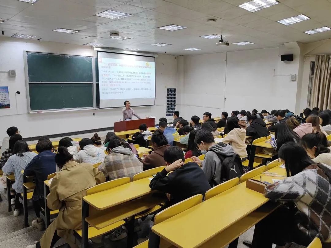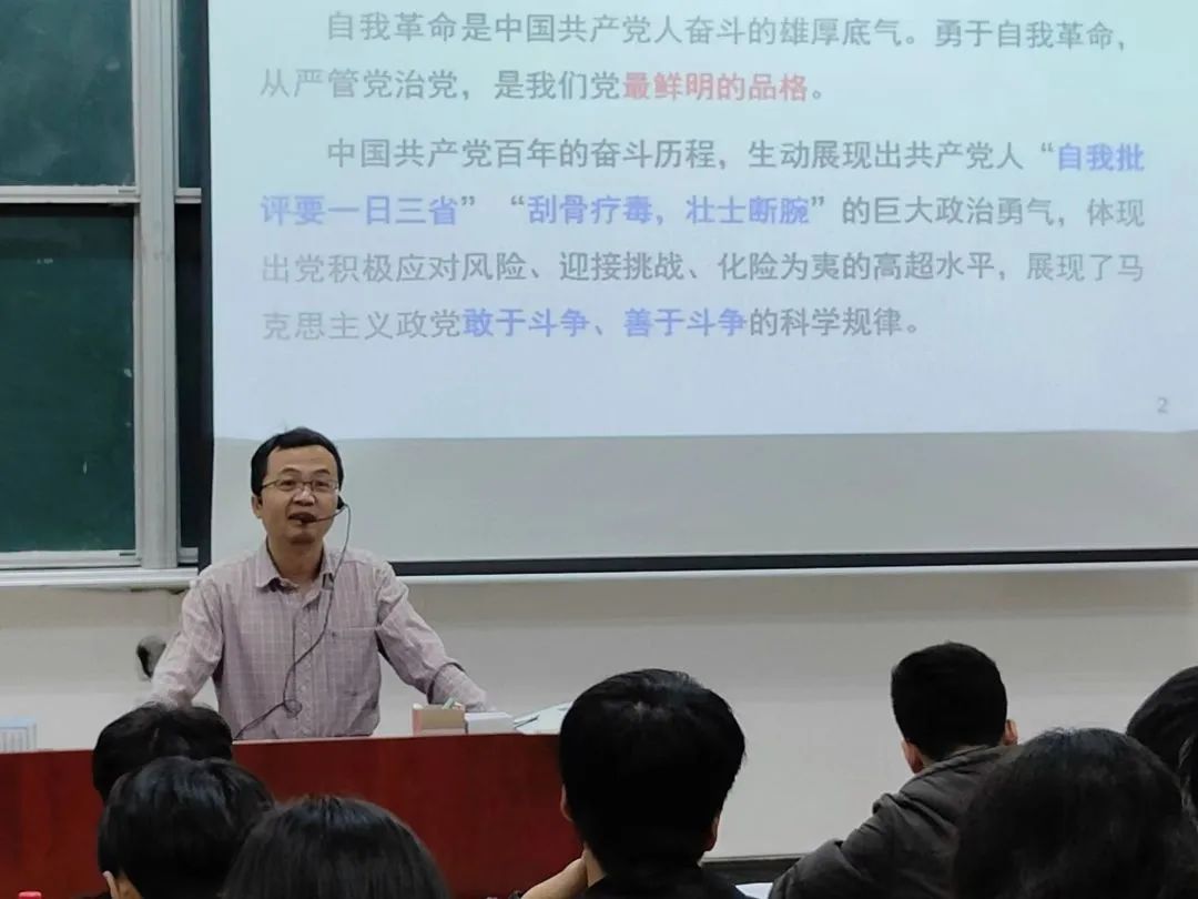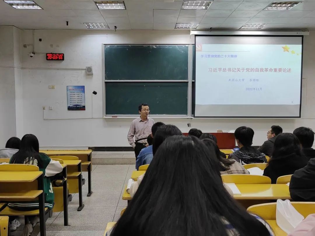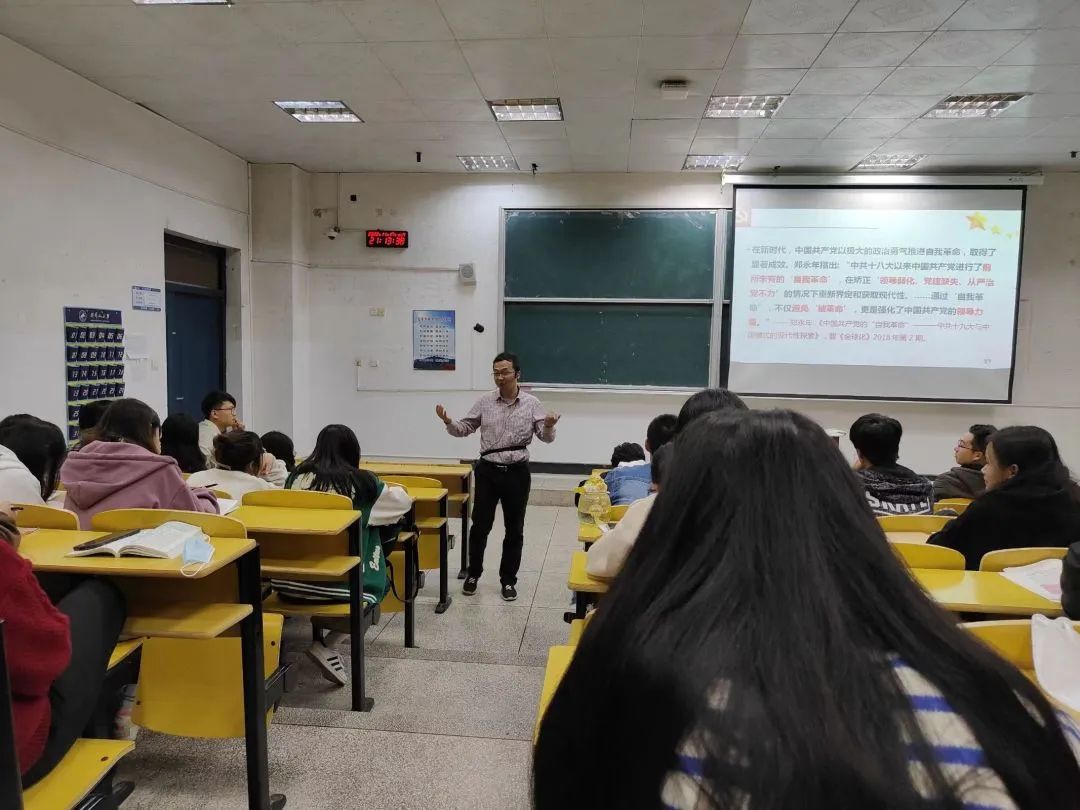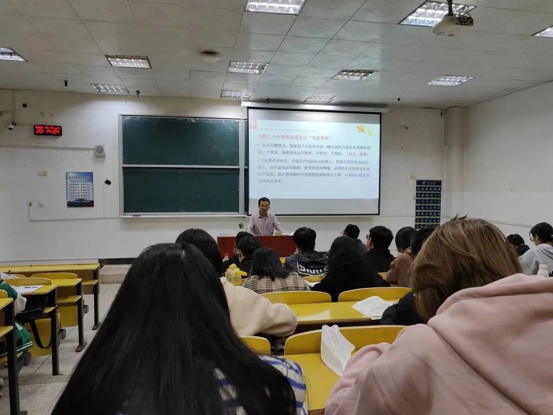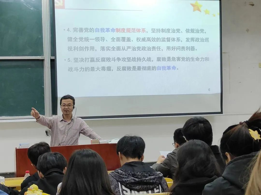 为深入学习贯彻党的二十大精神,2022年11月17日晚上8点,马克思主义学院开展了“习近平总书记关于党的自我革命重要论述” 主题讲座,本次讲座由学院副院长石劲松副教授主讲,学院19级思政班和19级党史班近90名同学到场学习。