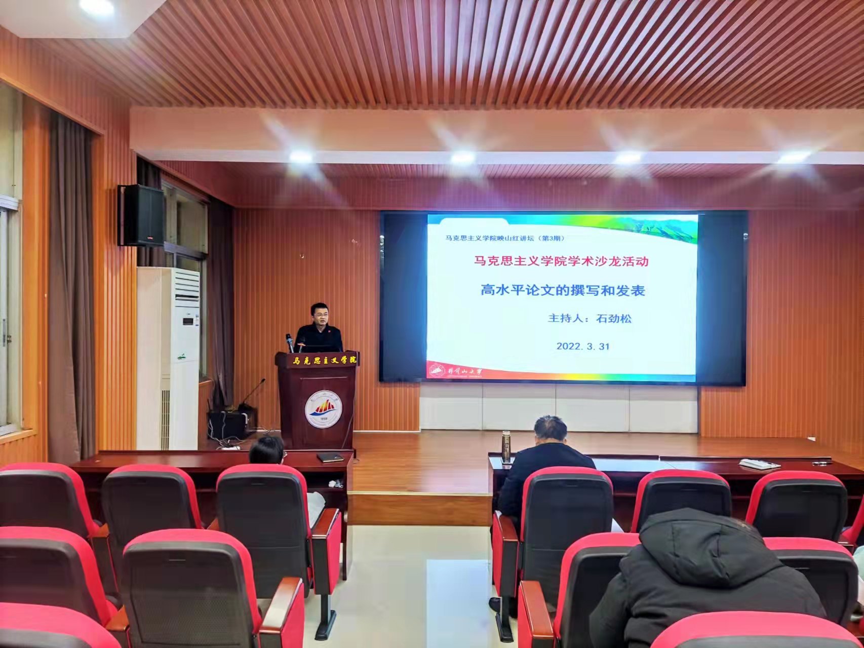为推动学院科研发展,助力一流学科建设和硕士点建设,调动学院科研积极性,争取更多高质量科研成果的突破,马克思主义学院于3月31日在学院一楼报告厅举办了本学期第一次学术沙龙,即马克思主义学院映山红讲坛第三期活动。活动主题是:高水平论文的撰写和发表。活动由学院副院长石劲松主持,全院教师参加。此次活动还邀请井冈山研究中心教师和外国语学院霍耀林博士参加。