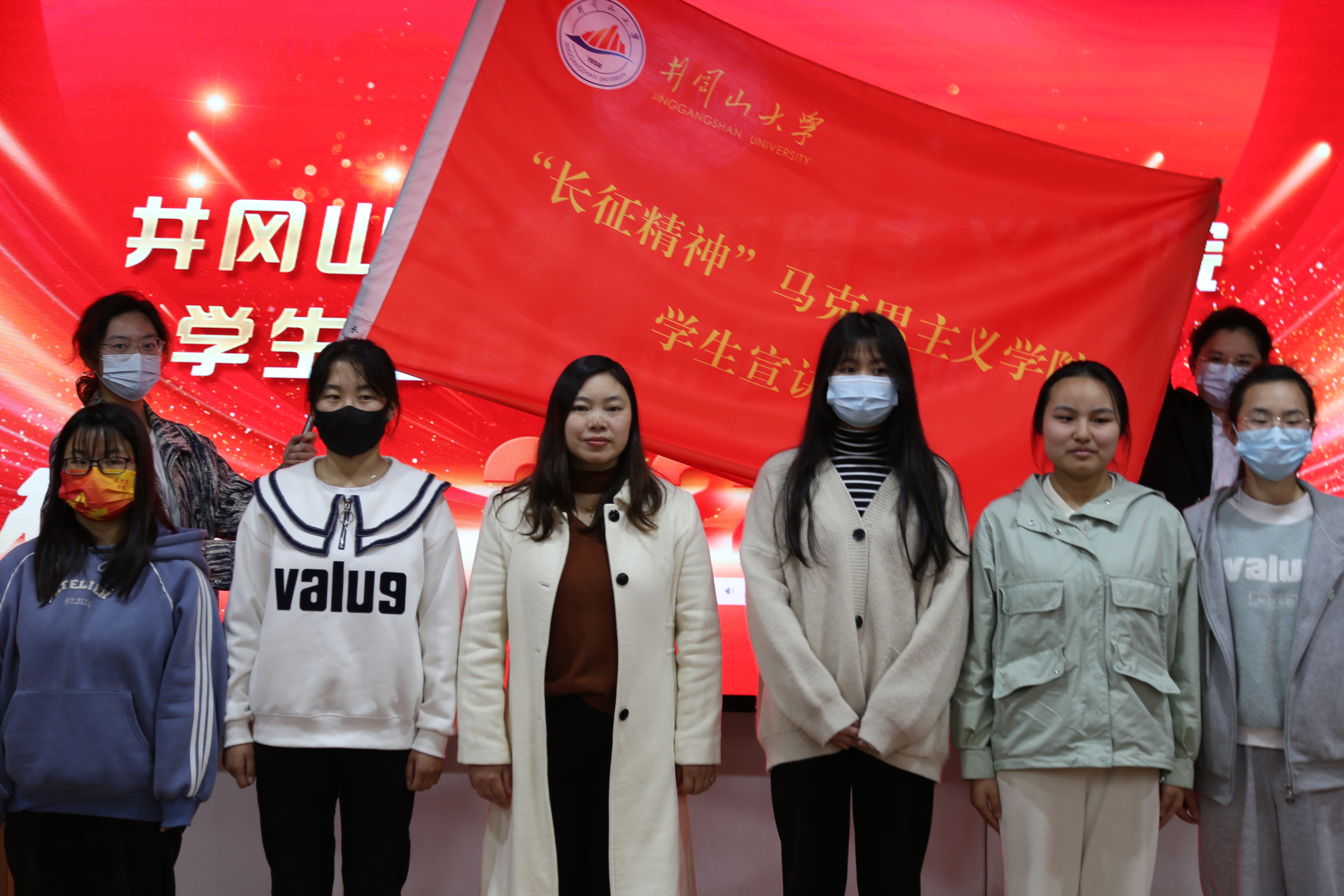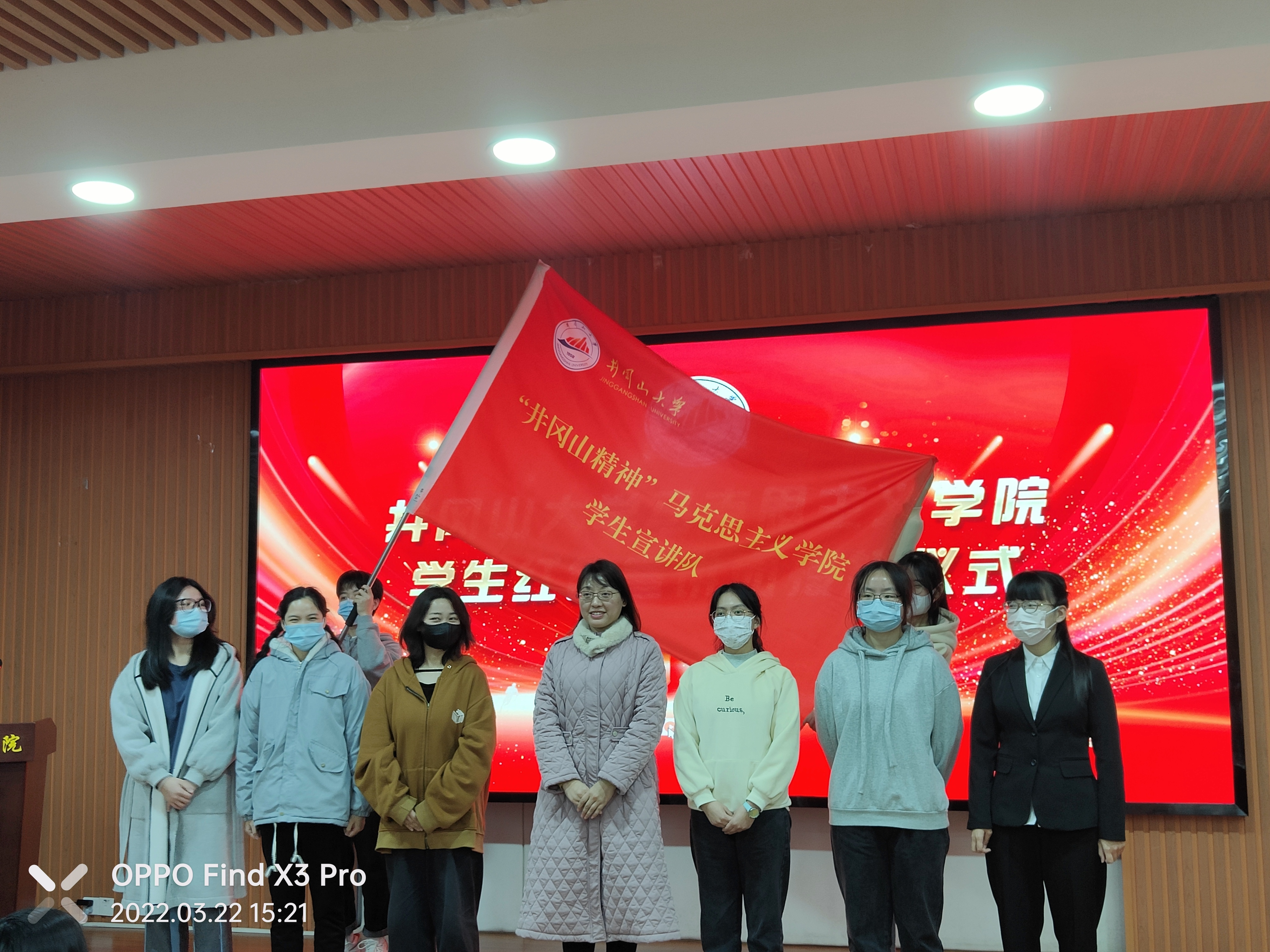 宣讲成员们也纷纷表示,接过旗帜就意味着扛上责任!将进一步深刻领会习近平新时代中国特色社会主义思想贯穿的坚定理想信念、高度自觉自信、无畏担当精神。在宣讲过程中突出理想信念,讲好红色故事,以昂扬的姿态持续奏响社会主义核心价值主旋律,成为一名马院最红的理论宣讲者,以昂扬的姿态喜迎党的二十大召开。(撰稿:吴丽花 审核:胡松 孙斌 叶丹)