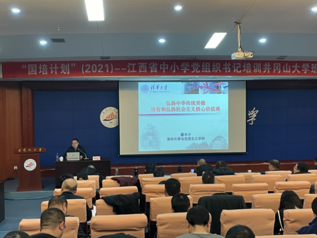 1月16日上午,戴木才教授还为“国培计划(2021)”——江西省中小学党组织书记培训井冈山大学班(第五期)作了一场专题报告,他围绕“中华传统美德,培育和弘扬社会主义核心价值观”这一专题,从社会主义核心价值观提出的简要历程,中华传统美德形成发展过程,中华传统美德的主要特点和作用,弘扬中华传统美德及培育社会主义核心价值观的对策建议等四个方面进行了深入浅出的阐述。报告语言生动、内容丰富、重点突出、见解精辟,融思想性、理论性、教育性于一体,对与会人员深入理解、准确把握和贯彻落实社会主义核心价值观,具有很强的指导意义。