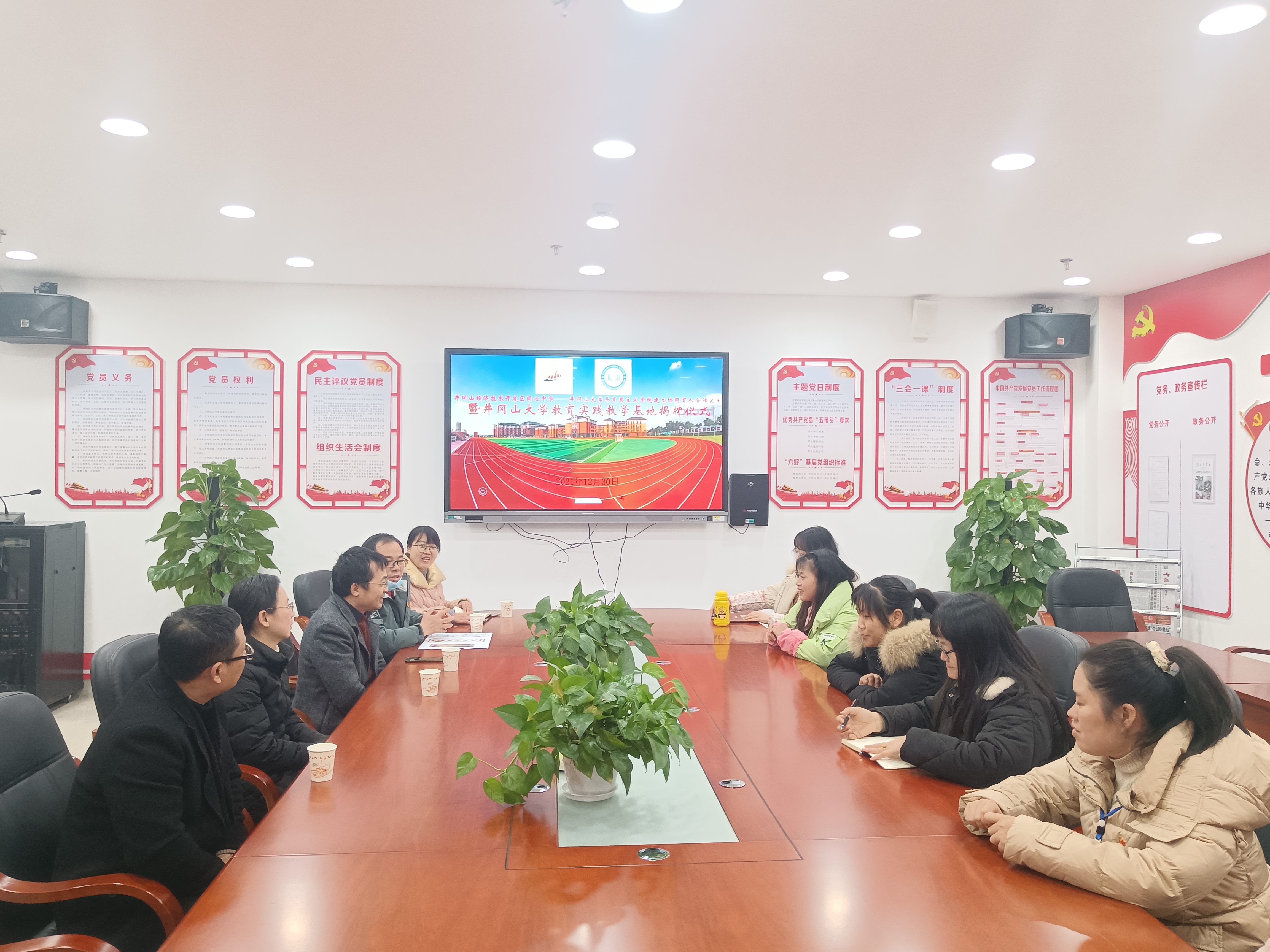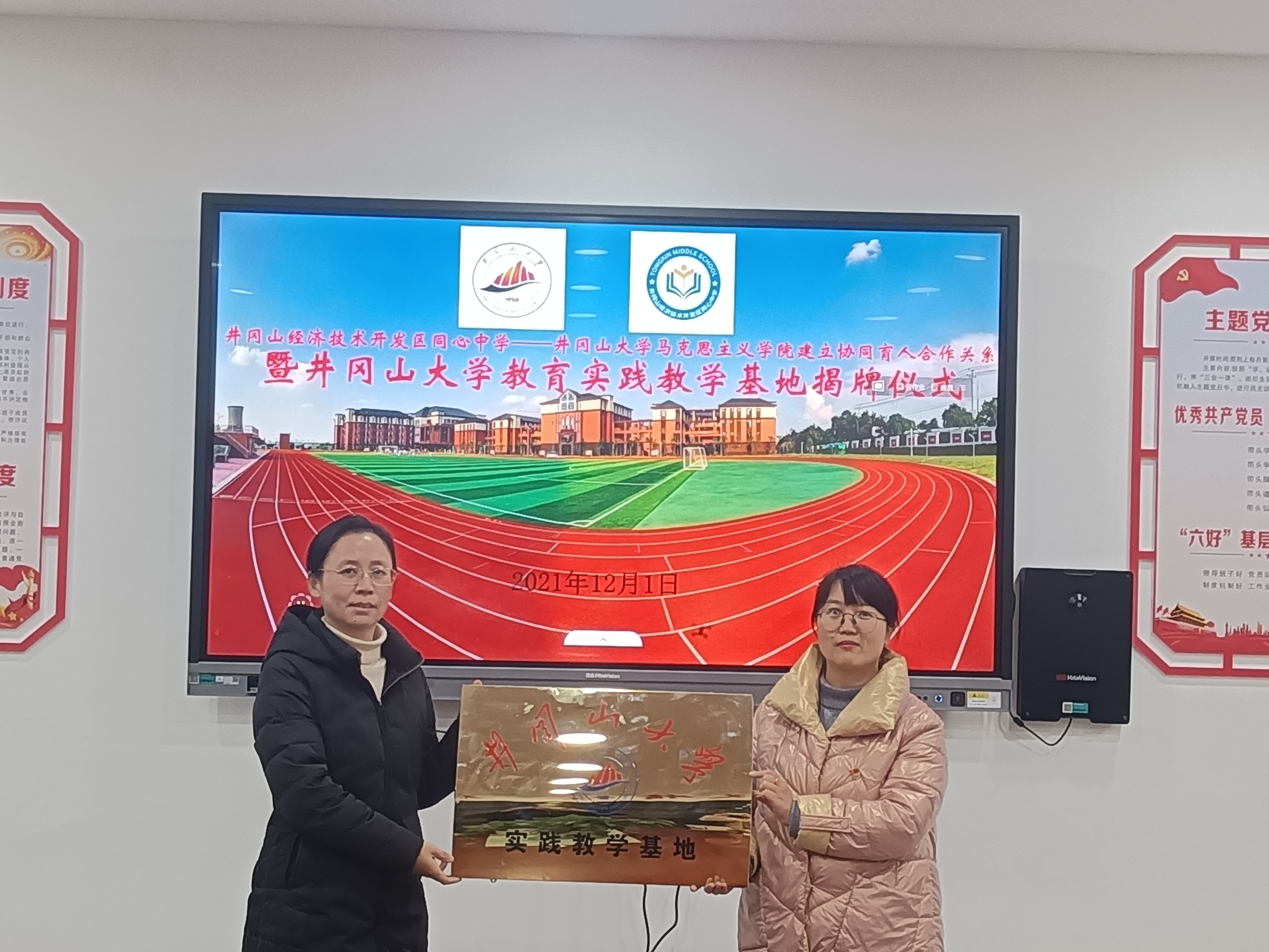 为进一步落实立德树人的根本任务,促进师范生的健康发展,提升师范生的教学技能。2021年12月31日,马克思主义学院副院长石劲松、毛丹、专业负责人肖海鹰、周庆峰等一行来到井冈山经济技术开发区同心中学商谈、签订实践教学基地。同心中学校长郑清泉、工会主席龙岗、政治课骨干教师等出席签约仪式。