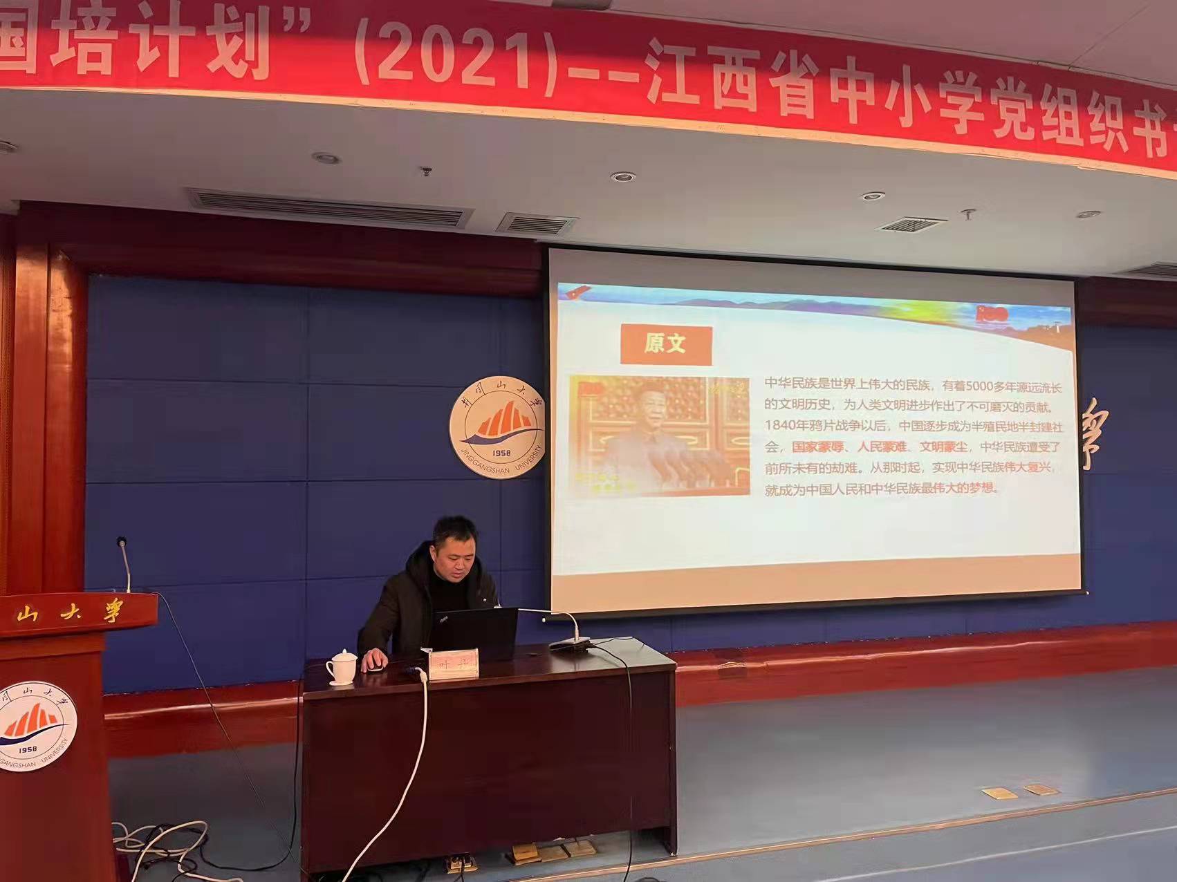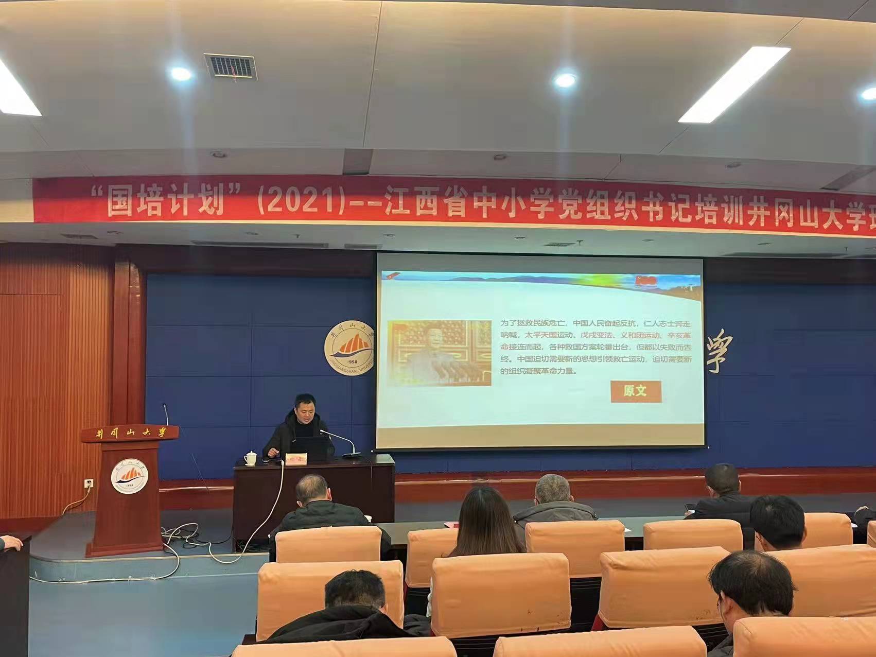 2021年12月26日下午14:30,井冈山大学马克思主义学院党委书记叶丹博士为“国培计划(2021)”——江西省中小学党组织书记培训班开展了一场以《解读“七一”讲话精神 回顾百年辉煌党史》为主题的专场报告。