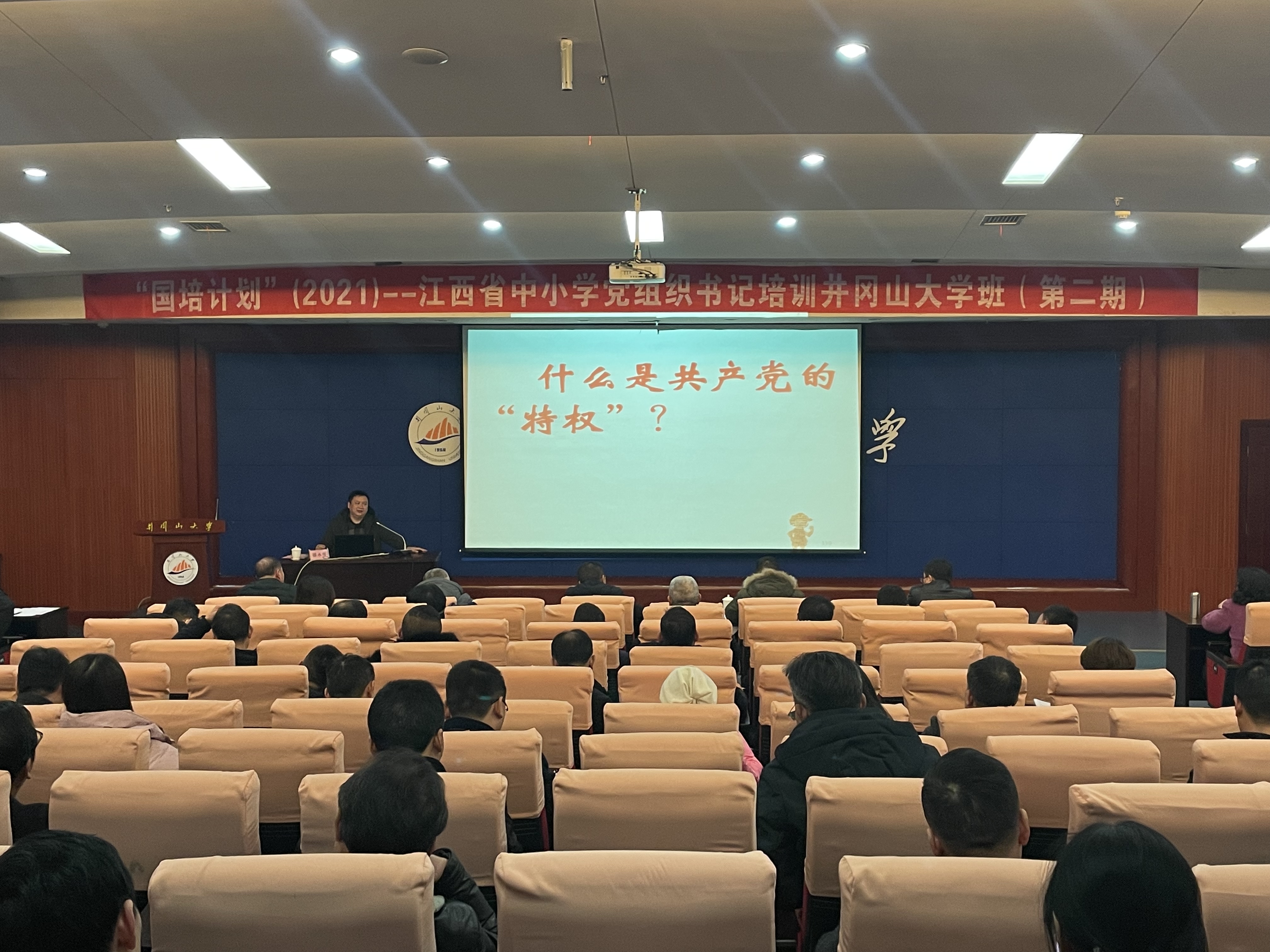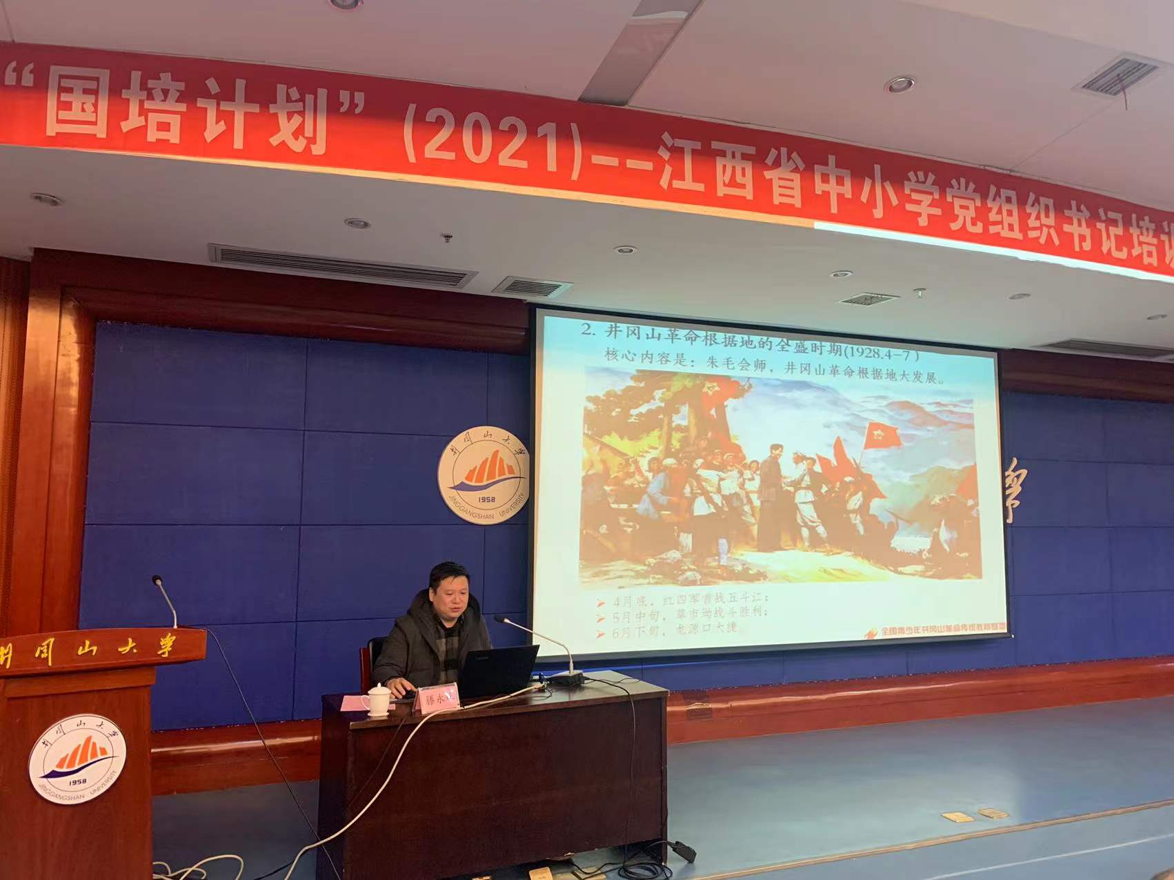 2021年12月26日上午,团中央井冈山教育基地办公室主任滕永琛博士为“国培计划(2021)”——江西省中小学党组织书记井冈山大学班第二期培训班开展《井冈山斗争史和井冈山精神》专题讲座。