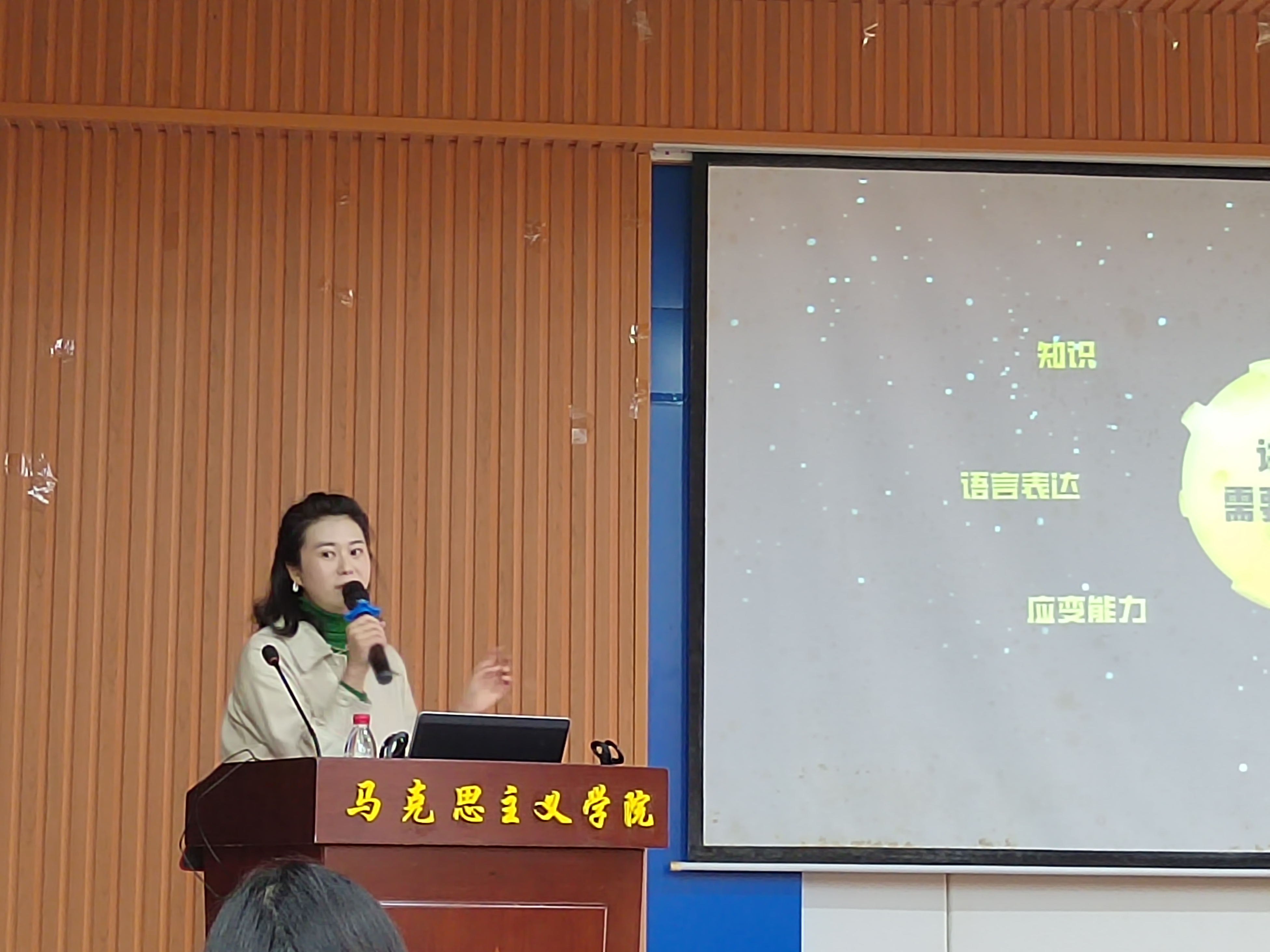 讲座内容丰富,深入浅出,发人深省。讲座内容包括“讲解的定义、讲解员所必需的能力、讲解员能力的用处、如何培养和打造这些能力”等五个方面内容。孙老师以自己人生经历为出发点,阐释讲解艺术的内涵。提出讲解就是将一件不会说话的历史文物,通过讲解员的口中重新“复活”过来,让观众们去重新体验历史文物背后的故事,让人们产生视觉听觉情感上的共鸣的行为。讲解员需要具备知识、优雅气质、语言表达、敏锐的观察力、应变能力及写作能力。同时,孙老师以文物“九龙灯”为例,深刻阐述其庐陵文化精神内涵实质,从语言上充分地展现讲解员的基本能力,体现了孙老师极高的职业素质,令台下学生佩服不已。