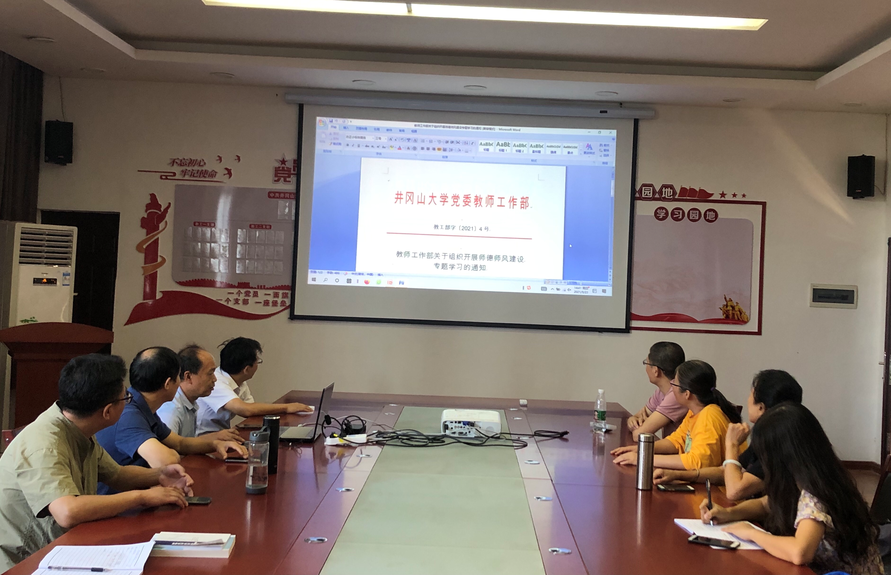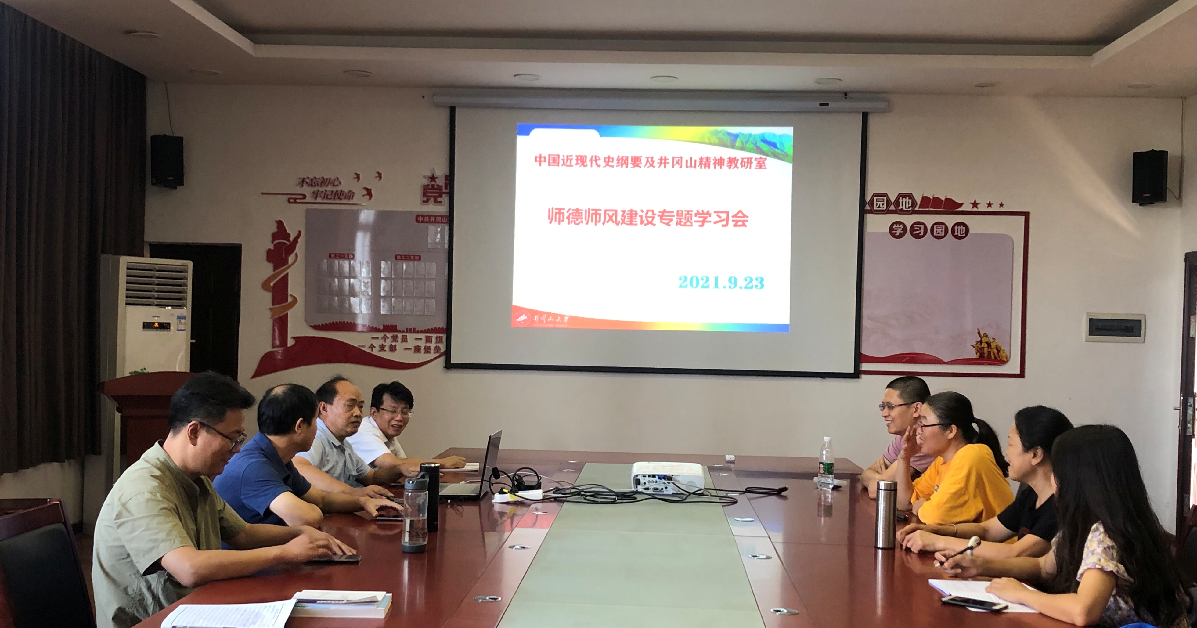 为进一步推进师德师风建设,提高我校教师的思想政治素质和职业道德修养,建设一支师德高尚、业务能力强的教师团队,根据学校和学院的安排和要求,2021年9月23日,纲要及井冈山精神教研室组织全体老师集中学习师德师风建设的文件和有关学习材料。系统学习了《高等学校教师职业道德规范》、《教育部“师德红七条”》、《教育部新时代高校教师职业行为十项准则》、《江西省高校教师师德失范行为处理实施办法》、《井冈山大学教师师德失范行为处理办法(试行)》等文件。