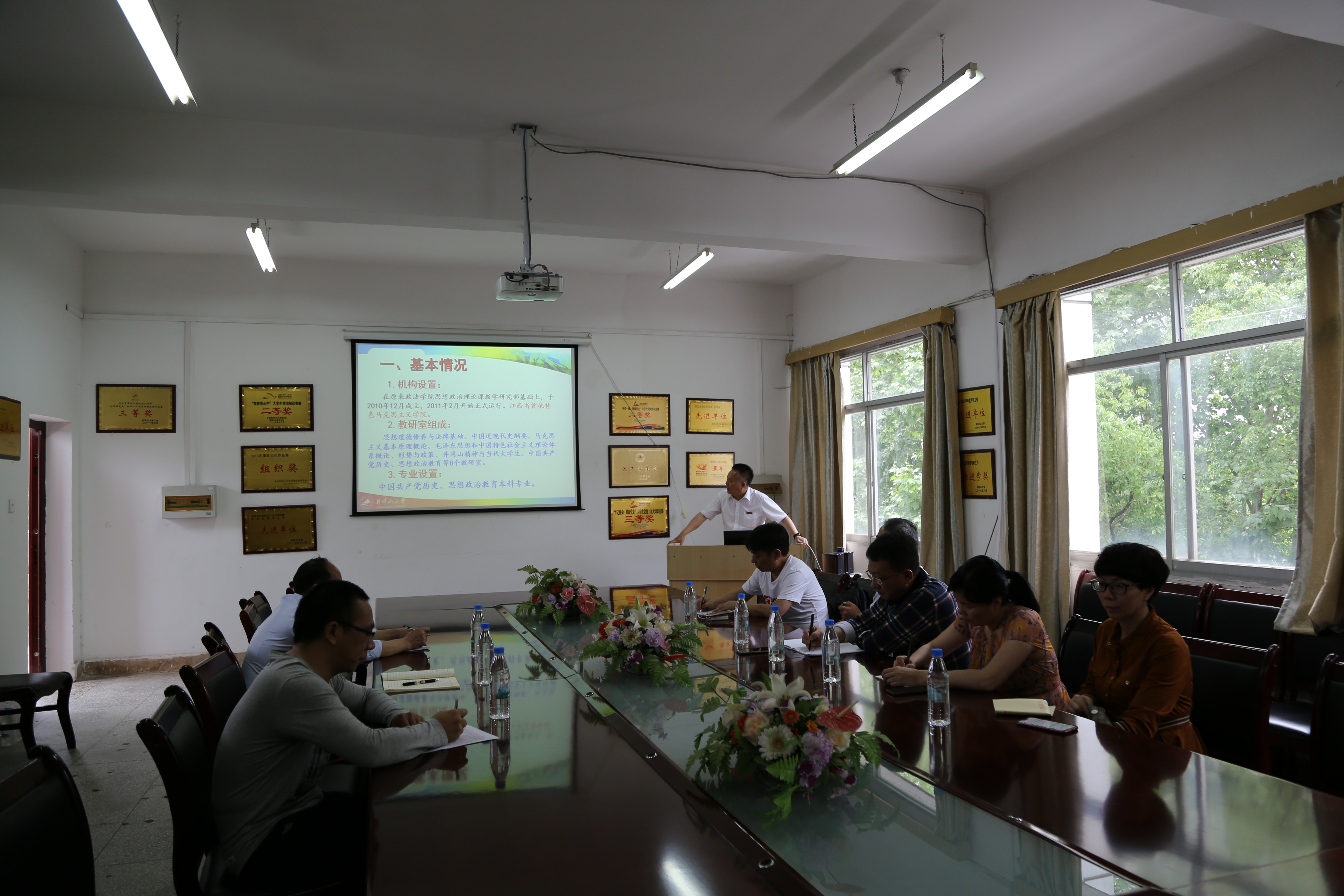孙斌副院长首先介绍了我院的师资、科研、教学及学科、专业建设等基本情况,他着重介绍了我院将井冈山红色基因融入思想政治理论课教学、省特色马克思主义学院建设情况、思政课实践教学开展的做法和经验。