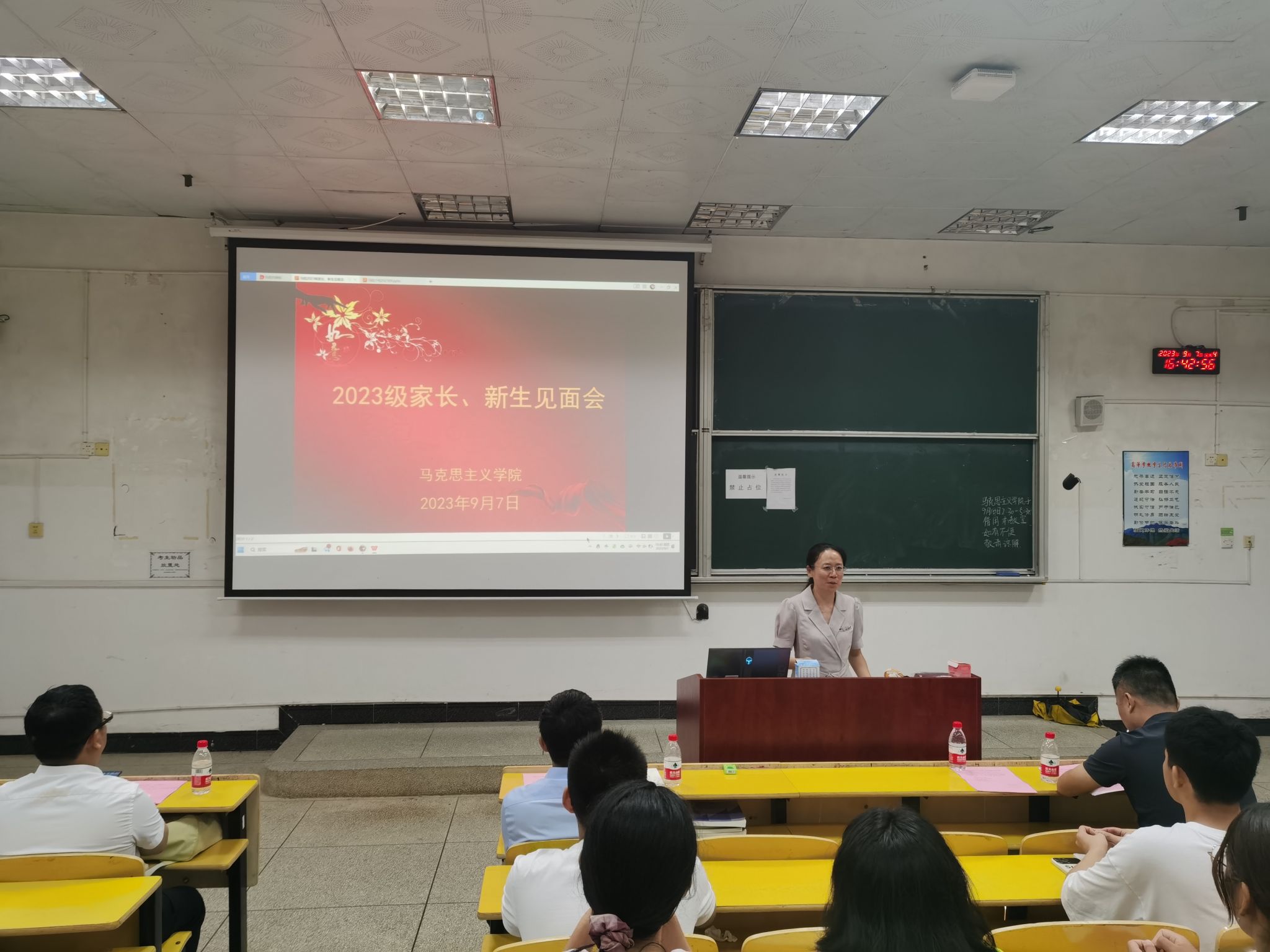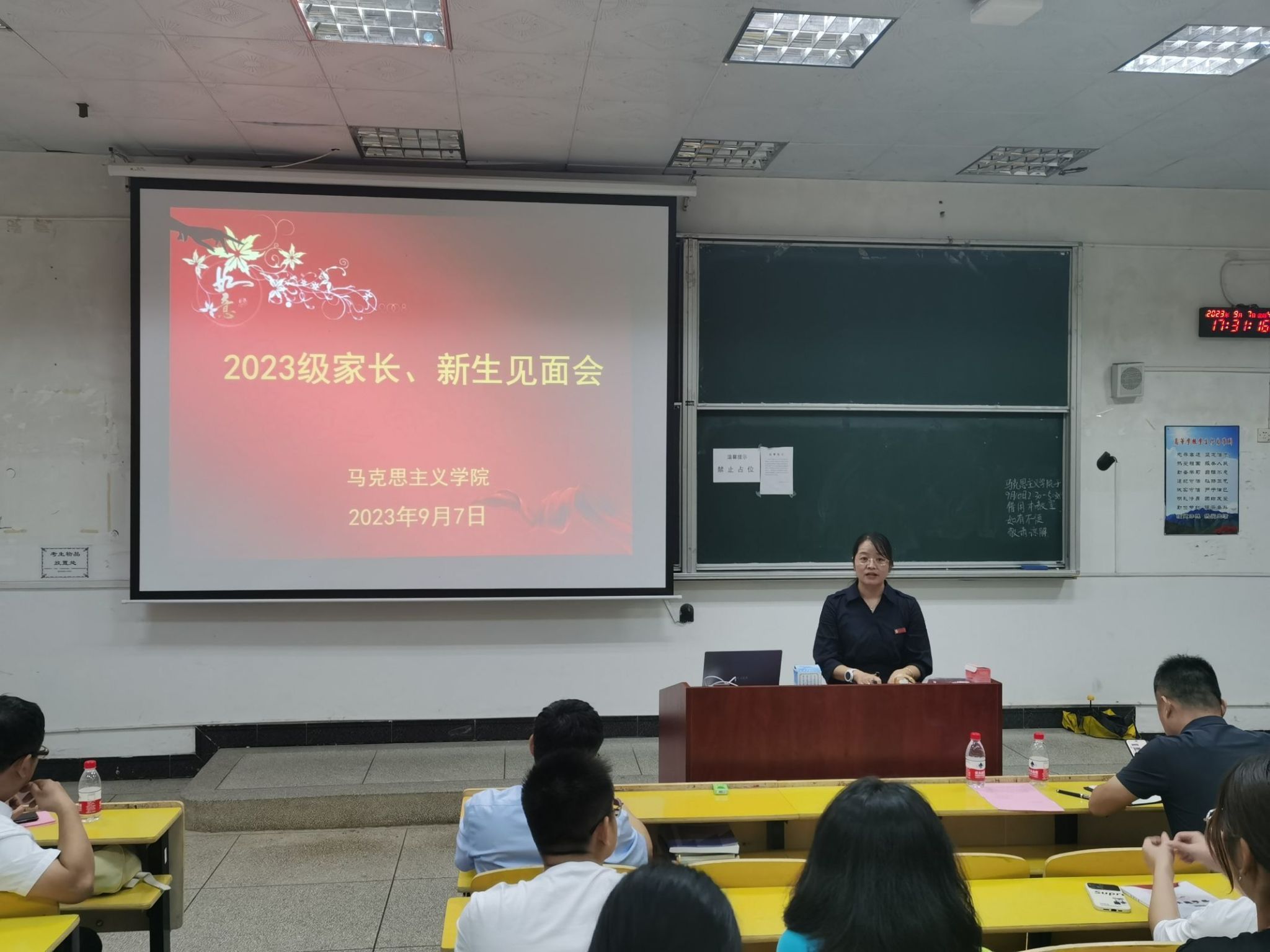 为让学生和家长进一步了解学院,形成新生入学教育合力,帮助学生更好地迈入大学生活,马克思主义学院2023年家长、新生见面会于9月7日下午在5栋105召开。学院党委书记叶丹、院长肖发生、副院长毛丹、副院长肖海鹰出席,学生科科长、2023级新生班主任、辅导员、班主任助理、新生及家长参加,会议由学院党委副书记吴丽花主持。
