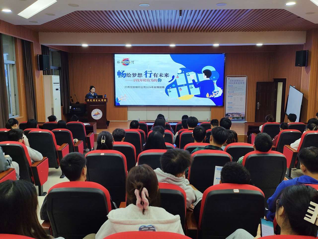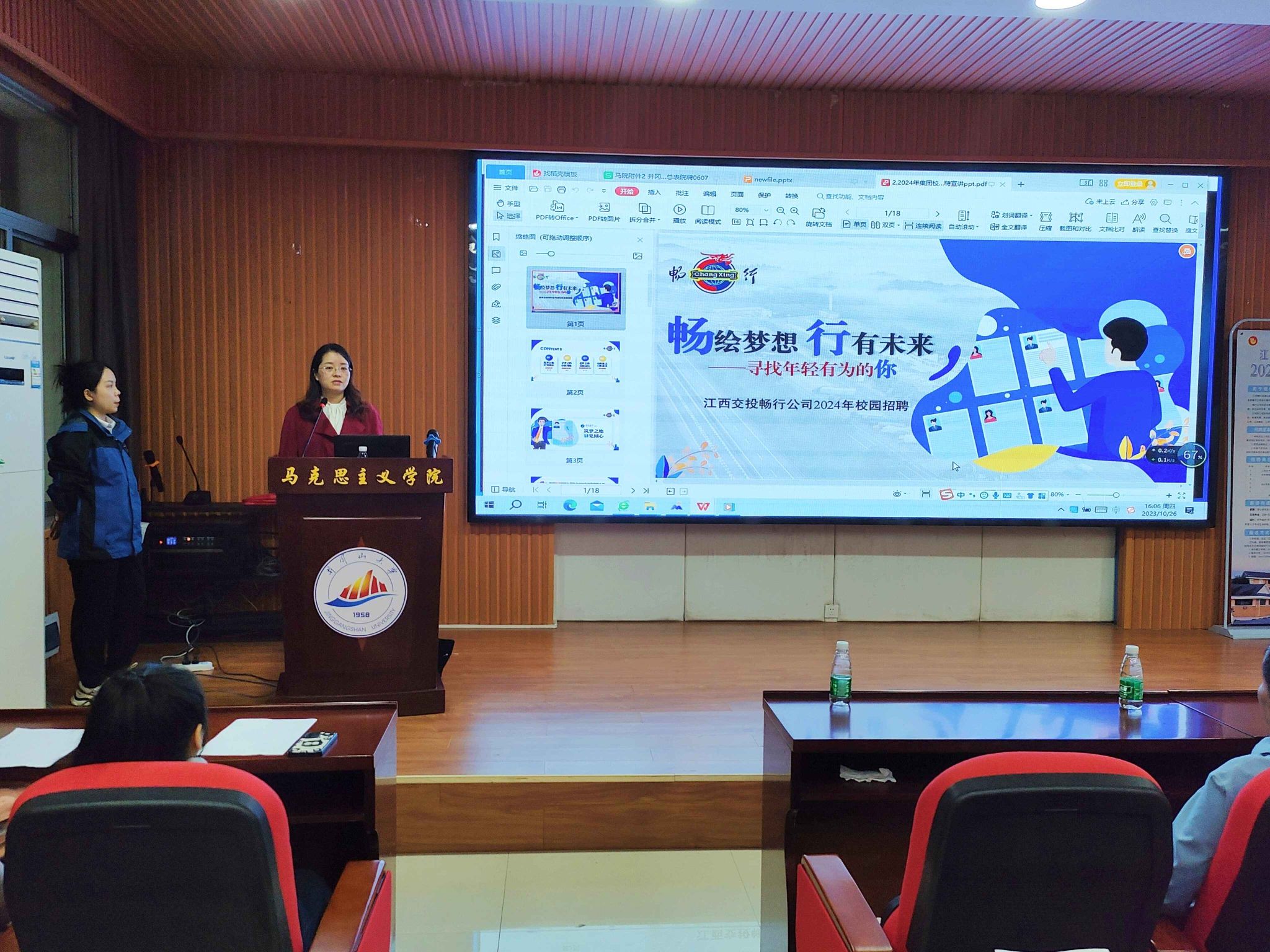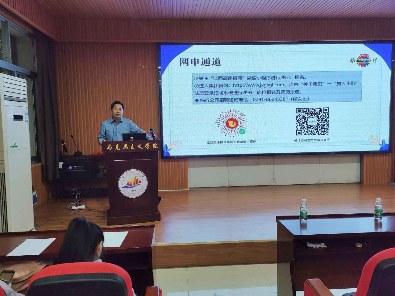 为增进毕业生对用人单位了解,实现毕业生充分就业,江西交投畅行高速公路服务区开发经营有限公司吉安公司于10月26日下午在1栋103教室进行宣讲。马克思主义学院、政法学院等9个学院的80余名学生参加本次宣讲会,会议由学院党委副书记吴丽花主持。