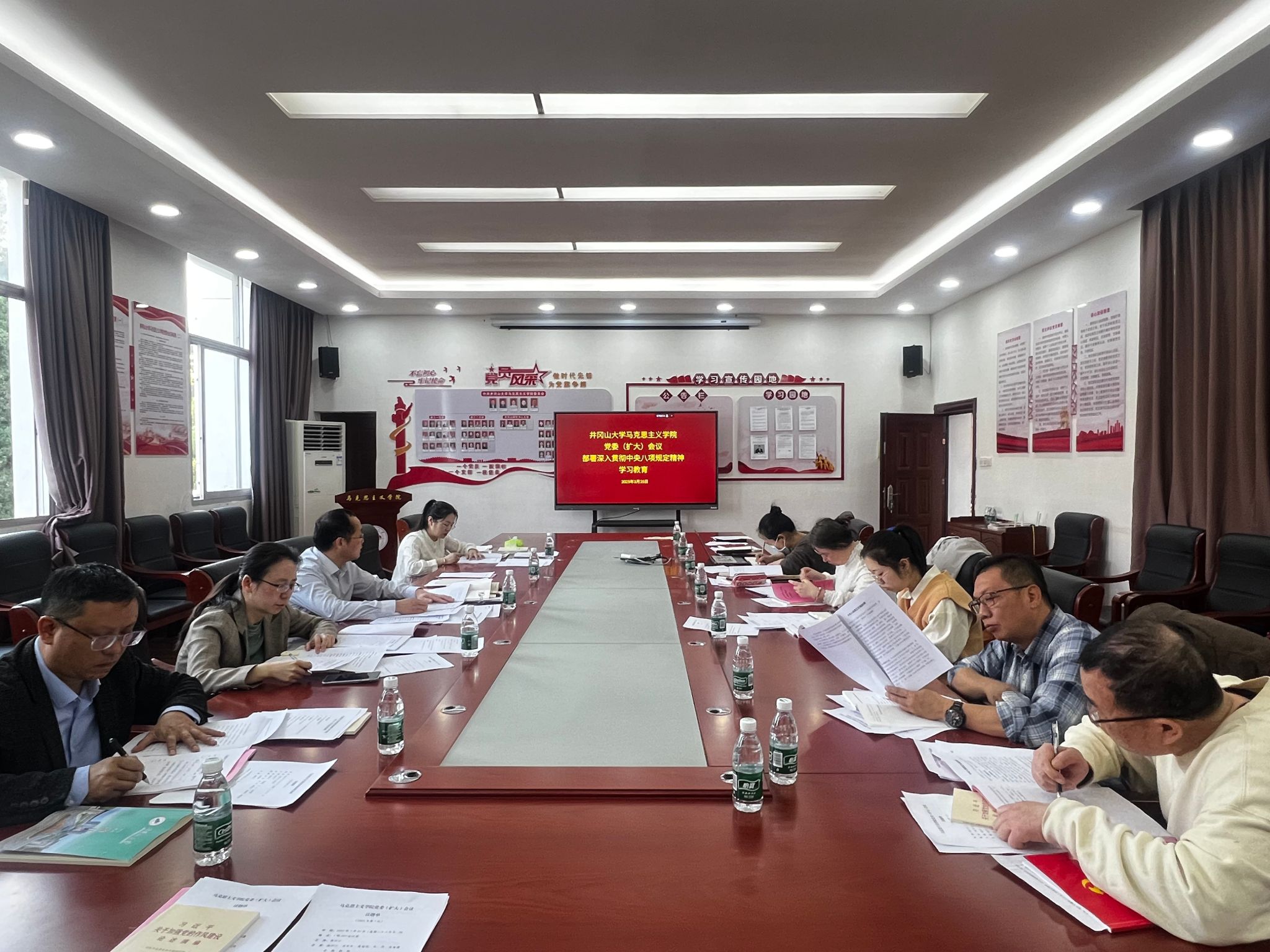 3月25日,马克思主义学院召开党委(扩大)会议,研究部署开展深入贯彻中央八项规定精神学习教育工作。校党委常委、副校长敖四江主持并讲话,学院领导班子成员、各科室负责人、各党支部书记参加会议。